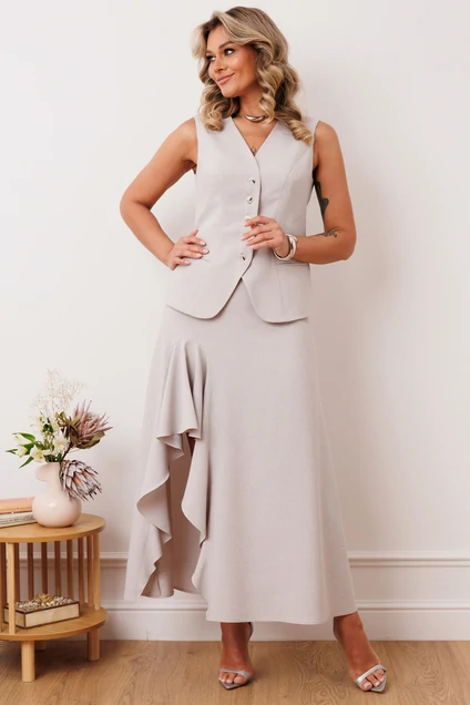 Комплект, состоящий из жилета и юбки. Жилет полуприлегающего силуэта, с рельефами по переду и спинке. На полочках обработаны карманы в рамку. Спинка со средним швом. Застежка центральная на петли-пуговицы. Юбка А-силуэта, с одной стороны с воланом, сверху юбка на притачном поясе, с резинкой по бокам. Застежка на тесьму-молнию в боковом шве. Жилет на подкладке. длина жилета: 59,5 см