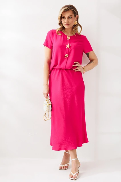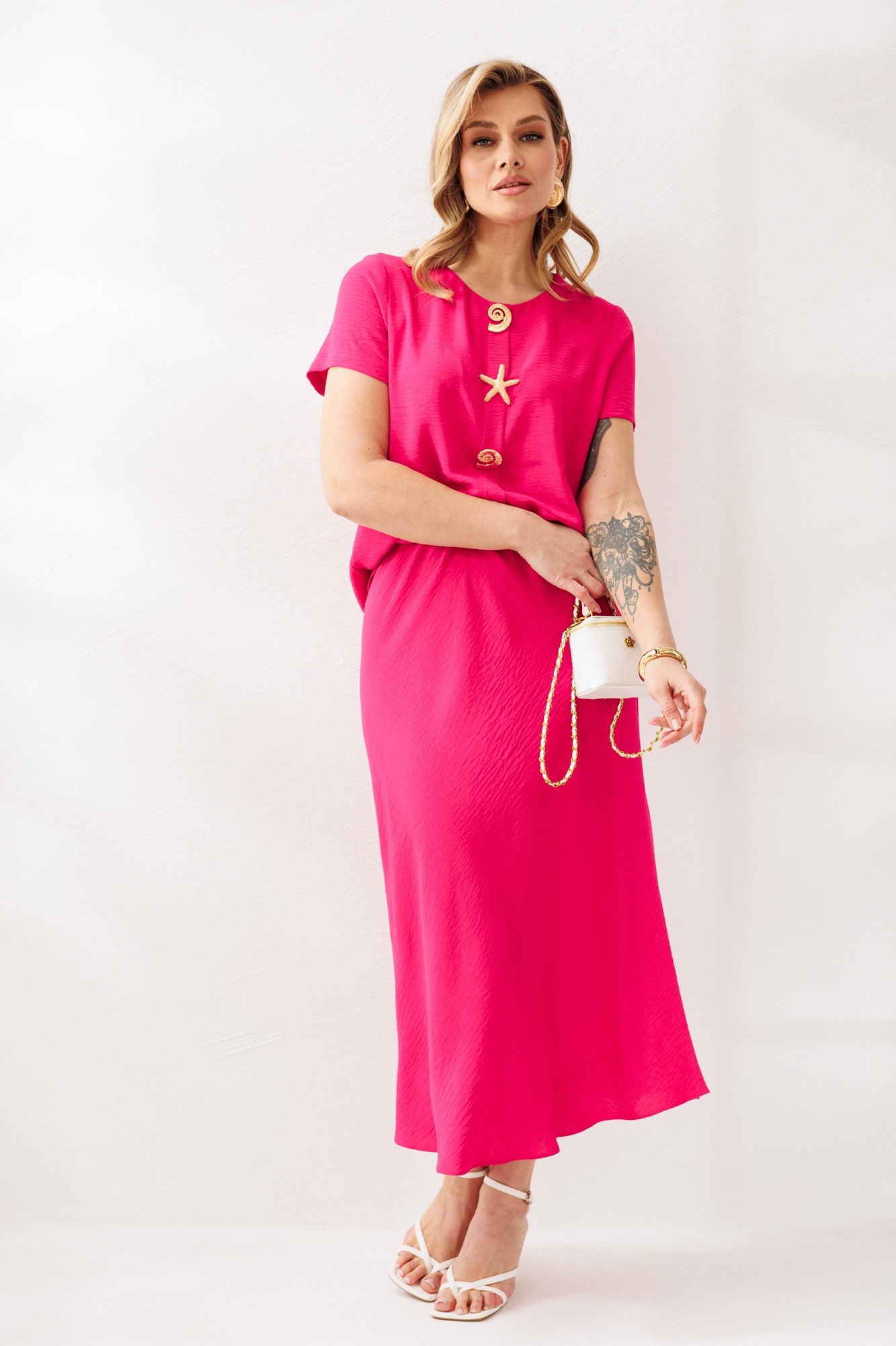 Костюм с юбкой 333 фуксия Мублиз — это стильное решение для вашего гардероба. Коллекция бренда Мублиз предлагает нарядный женский костюм, выполненный из костюмно-плательной ткани с добавлением эластичности. Блуза прямого свободного силуэта украшена декоративной складкой и съемными брошуками. Юбка, расширенная к низу, оснащена эластичной резинкой на поясе для комфортной посадки. Костюм идеально подходит для нарядных мероприятий в весенний и летний сезоны и выполнен в насыщенном фуксиевом цвете.