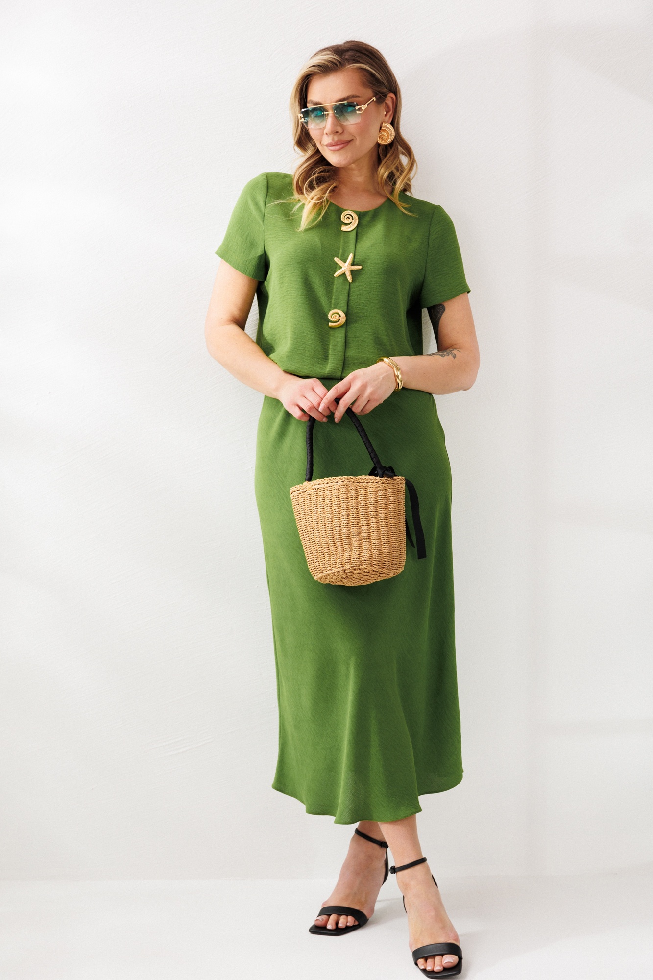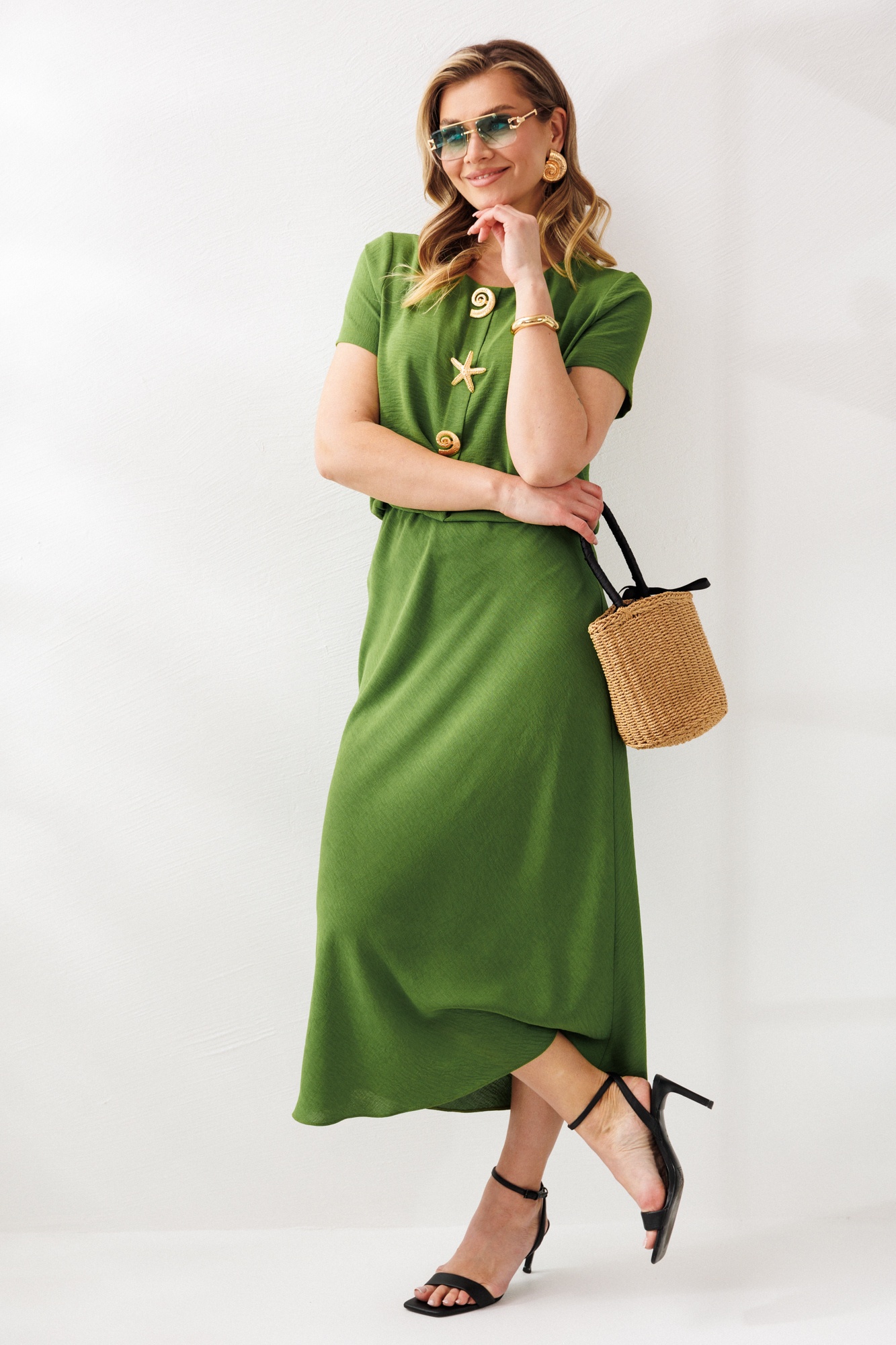 Костюм с юбкой 333 олива Мублиз — это нарядный комплект, включающий блузу и юбку, выполненные из костюмно-плательной ткани с эластичными свойствами. Коллекция бренда Мублиз предлагает вам сочетание комфорта и стиля. Блуза свободного силуэта украшена декоративными элементами и округлой горловиной, а её рукава одношовные и втачные, что добавляет элегантности. Юбка расширяется к низу и снабжена эластичной резинкой в поясе для удобной посадки. Этот оливковый костюм без подкладки идеально подходит для праздничных мероприятий, подчёркивая вашу индивидуальность и отвечая современным модным трендам. Фасон ориентирован на тёплый сезон, обеспечивая комфорт в носке.
