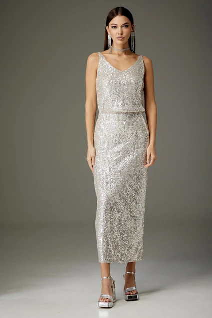 Юбка: прямого силуэта выполнена из трикотажного полотна с эффектом «пайеток», длина изделия «мидакси». Изделие на подкладке. Пояс изделия оформлен эластичной тесьмой, заднее полотнище юбки имеет разрез выше уровня колена.