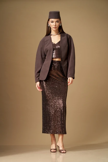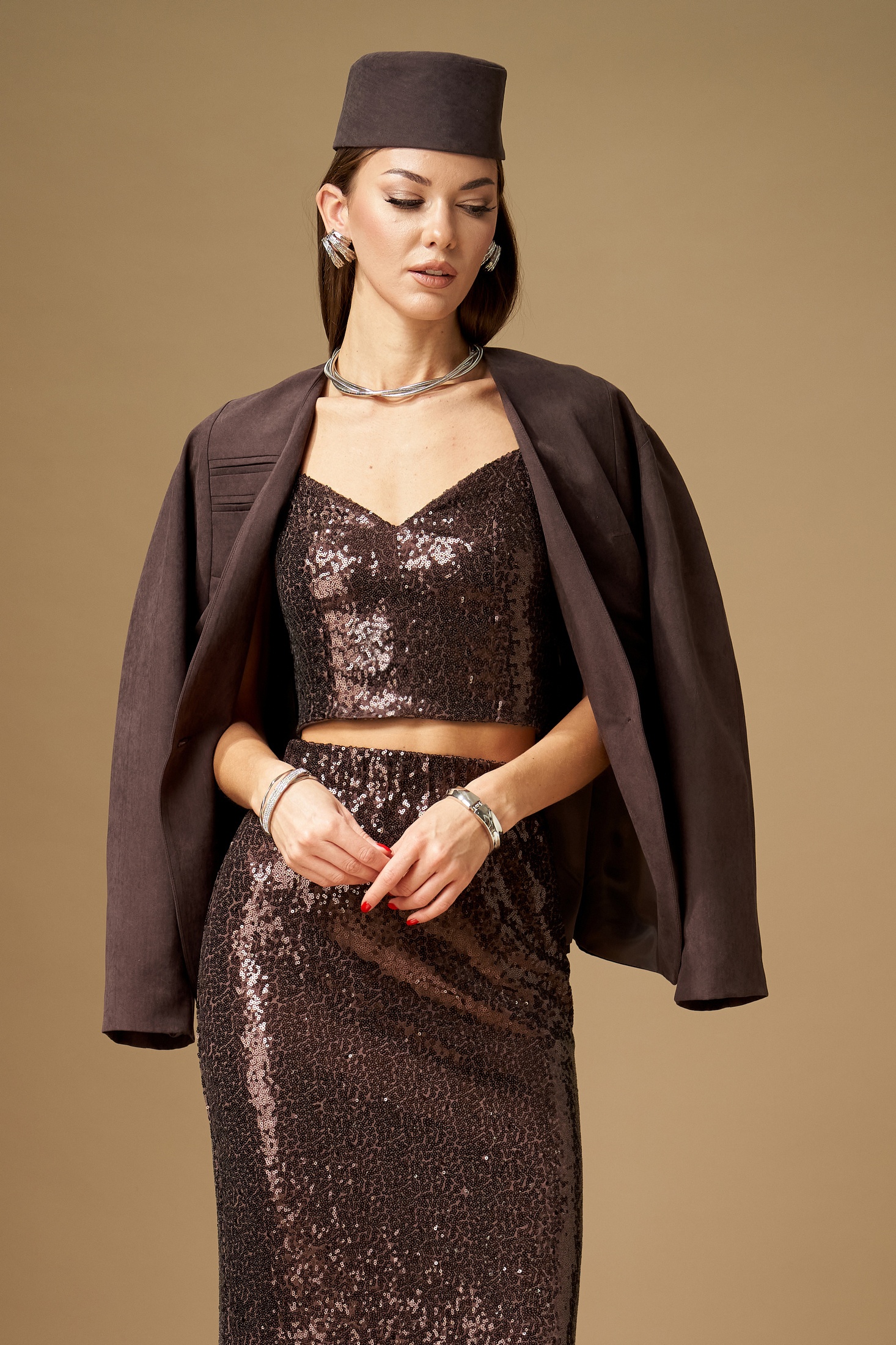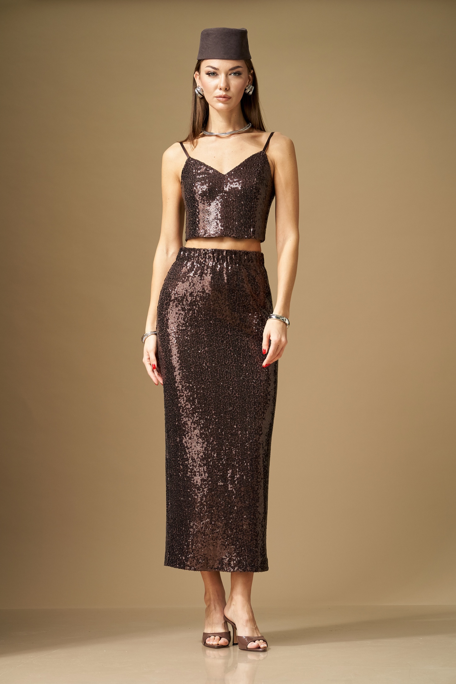Юбка женская, зауженная книзу, с цельнокроеным поясом, на резинке. Заднее полотнище со средним швом, в котором расположен разрез. Юбка выполнена из ткани с пайетками, на трикотажной подкладке. Юбка длиной «мидакси».