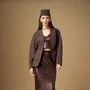 Жакет прилегающего силуэта со спущенным плечом, с центрально-бортовой застежкой на одну пуговицу в области талии. Горловина У-образной формы с расходящимся закругленным краем борта внизу. По переду рельеф от плеча, переходящий в подрез, в котором выполнены карманы в рамку. На правой центральной части сверху выполнена два кармана в рамку разной длины (имитация) Спинка со средним швом и двумя рельефами от плеча. Рукав длинный, двухшовный, снизу с вытачкой, для увеличения объема рукава в верхней части. Жакет на подкладке.