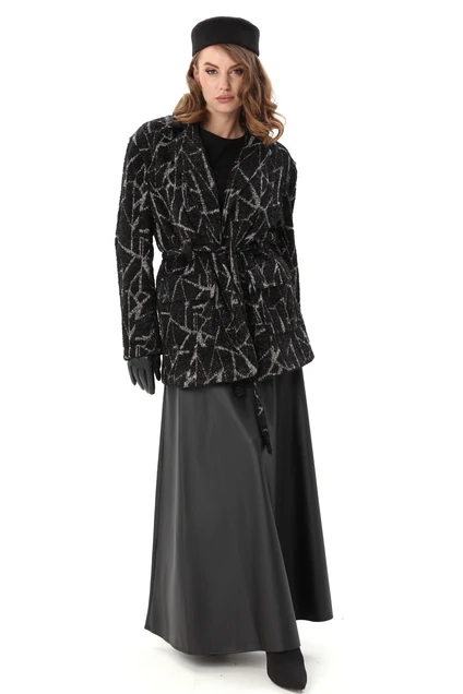 Костюм двухпредметный: состоит из кардигана и юбки. Кардиган свободного прямого силуэта длиной макси. Изделие со съемным поясом и накладными карманами. Рукав втачной, двухшовный, пройма приспущена. Воротник английский. Застежка не предусмотрена. В боковых швах разрезы. Юбка - солнце макси с узким поясом. В боковых швах расположены карманы. Застёжка на петлю и пуговицу и молнию по спинке.