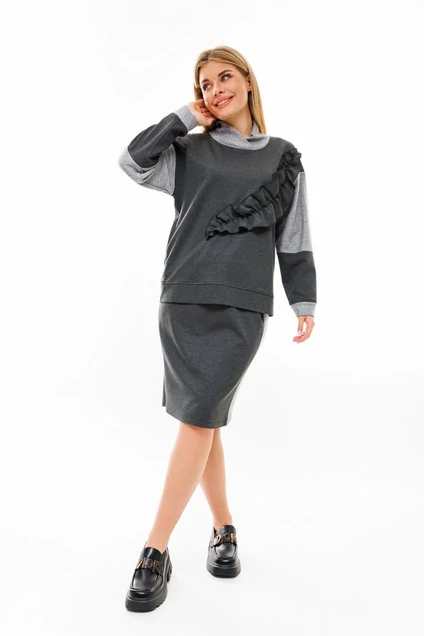Трикотажный костюм двухпредметный: состоит из джемпера и юбки. Джемпер комбинированный свободного кроя со спущенной линией плеча. Горловина обработана воротником-стойкой с запахом. Рукава со вставкой из текстурного трикотажа "косичка". По низу рукава и изделия есть манжета. По переду изделие декорировано фигурными фалдами из основной ткани. Длина изделия 71 см. Длина рукава 58 см. Юбка-карандаш на резинке по линии талии. По боковым швам изделие декорировано трикотажной "косичкой".
