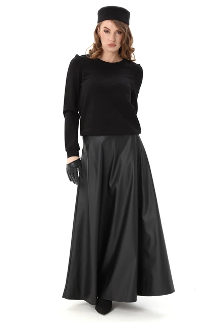 Двухпредметный женский костюм, идеально сочетающий уют и стиль. Комплект состоит из элегантного джемпера и пышной юбки макси. Джемпер выполнен в черном цвете, оснащен округлой горловиной и рукавами-регланом с оригинальными защипами, которые придают образу женственность. Рукава украшены съемными декоративными элементами в виде цветка из той же ткани, что добавляет изысканности. Юбка солнце макси также представлена в черном цвете, имеет элегантный узкий пояс, удобные карманы в боковых швах и застежку на петлю и пуговицу с молнией на спине. Этот костюм отлично подойдет для создания изысканного и запоминающегося образа.