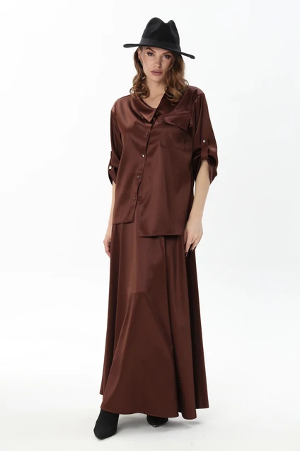 Костюм комбинированный двухпредметный: состоит из жакета и юбки. Жакет рубашечного типа прямого силуэта с асимметричным низом. Рукав втачной со спущенной линией плеча, фиксируется на пату. Застежка центральная на петли и пуговицы, смещённая по косой. На левой полочке накладной карман с клапаном. Воротник отложной на стойке до половины спинки. Юбка - солнце макси с узким поясом. В боковых швах расположены карманы. Застёжка на петлю и пуговицу и молнию по спинке.