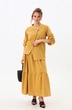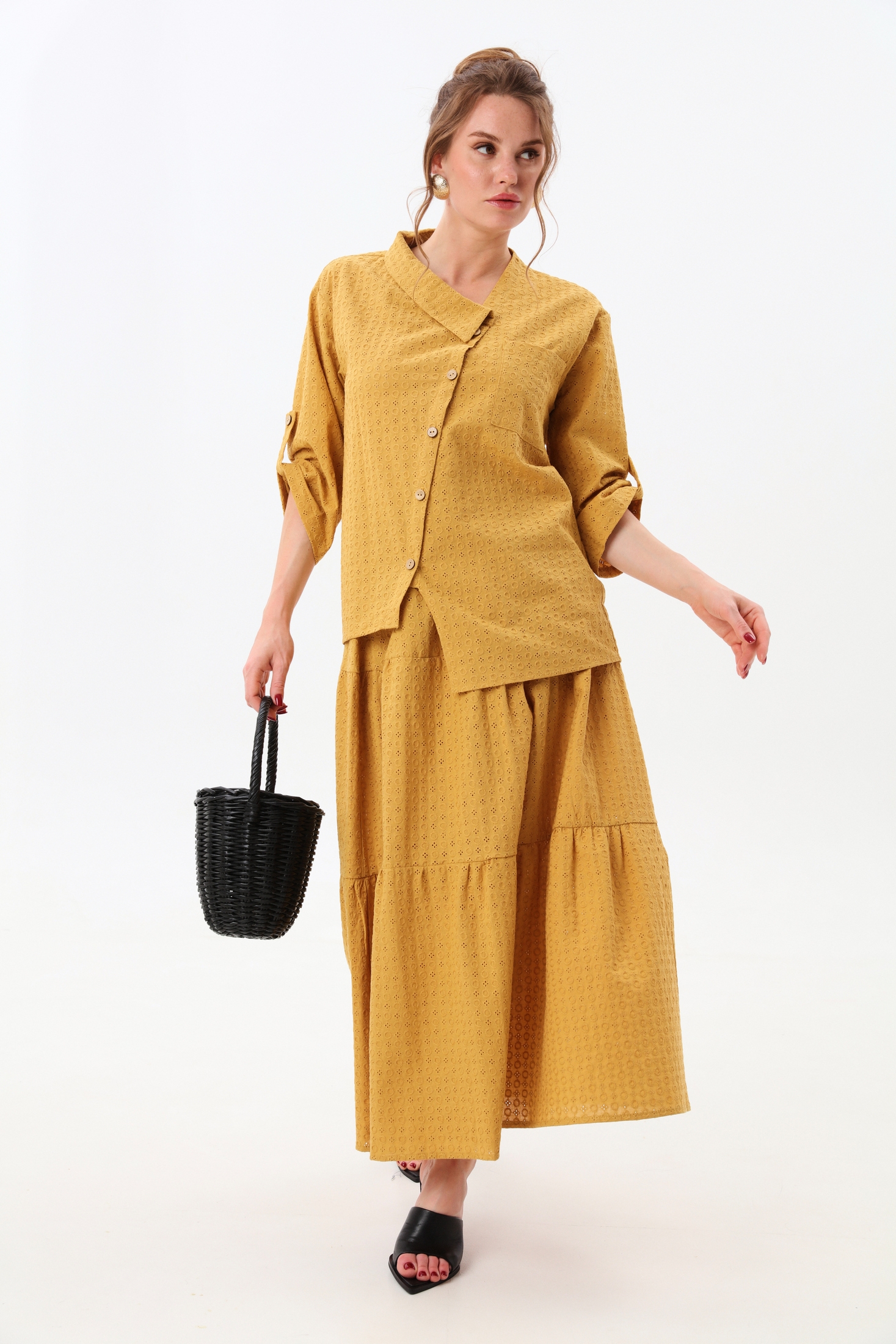 Костюм двухпредметный: состоит из жакета и юбки.Жакет рубашечного типа прямого силуэта с асимметричным низом. Рукав втачной со спущенной линией плеча, фиксируется на пату. Застежка центральная на петли и пуговицы, смещённая по косой. На левой полочке накладной карман с клапаном. Воротник отложной на стойке до половины спинки. Юбка - солнце макси с узким поясом на резинке с тремя воланами.