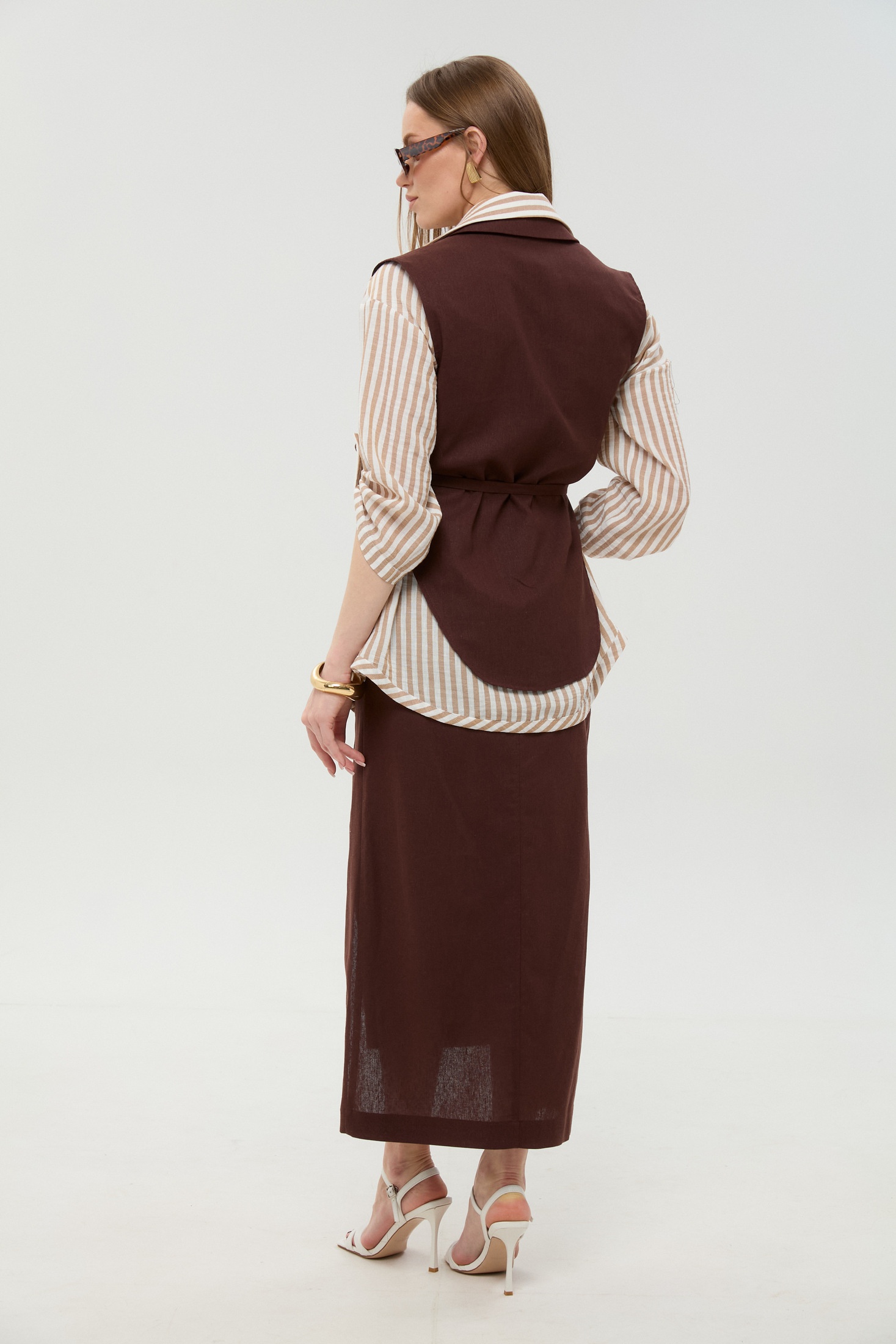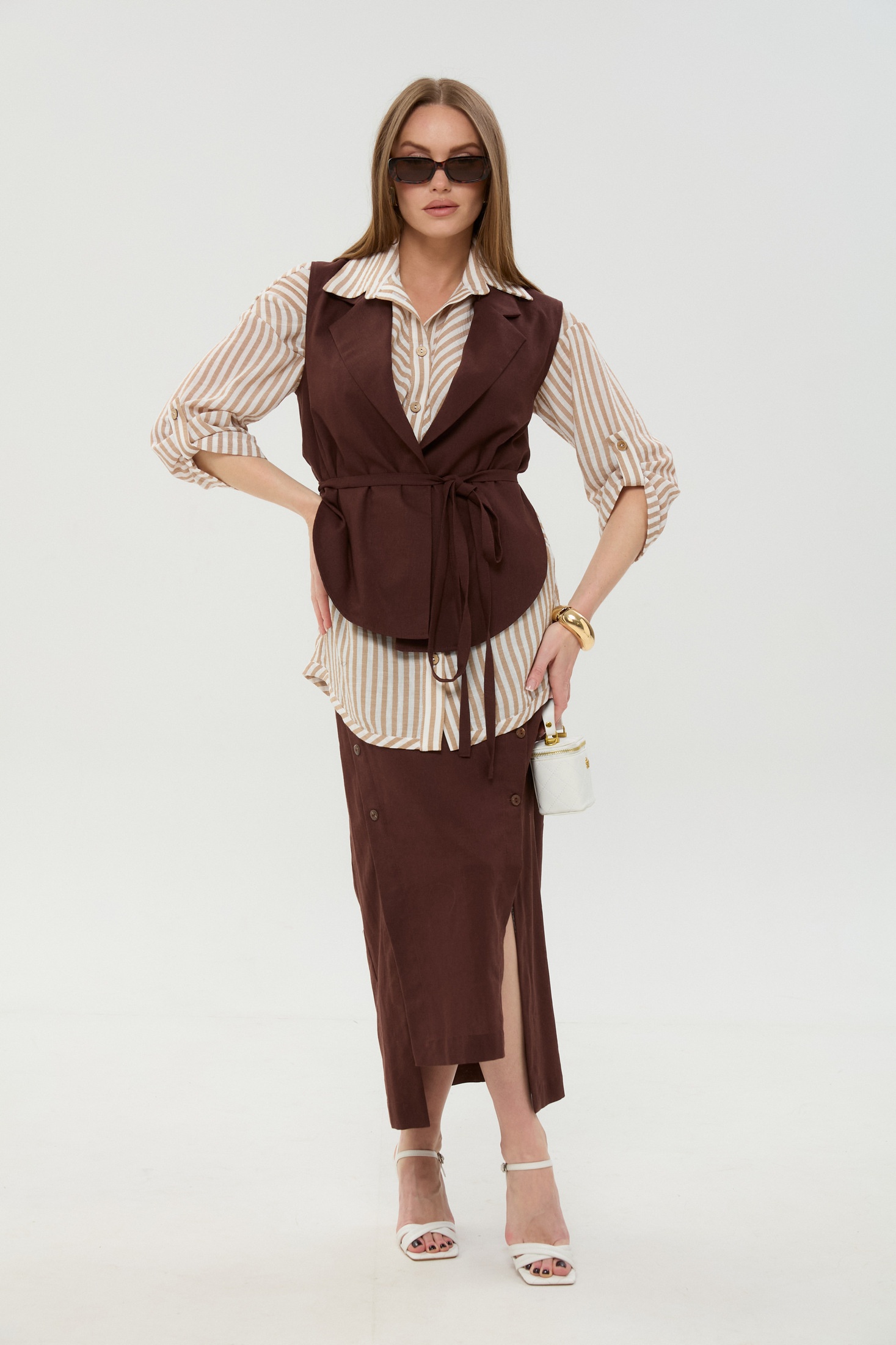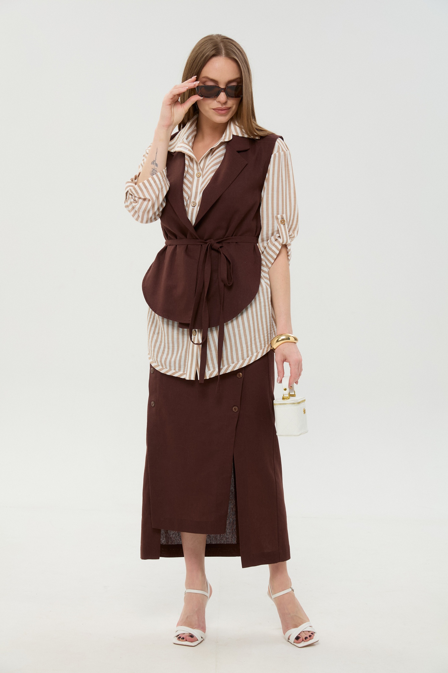 Костюм с юбкой 957-3 шоколад + песочные полосы NikVa — это идеальное сочетание стиля и комфорта на каждый день. Коллекция бренда NikVa предлагает изысканный трёхпредметный комплект, состоящий из рубашки, жилета и юбки. Рубашка выполнена из 100% хлопка, что обеспечивает легкость и дыхание ткани, с рубашечным воротником и застежкой на пуговицы, а также со стильными патами на рукавах. Жилет в пиджачном стиле добавляет строгости и завершенности образу. Юбка из смеси льна, вискозы и хлопка, длиной миди, обеспечивает комфорт в движении, а асимметричный крой добавляет нотку трендовости. Костюм, выполненный в теплых шоколадных и песочных оттенках, идеально подойдет для осенне-весеннего сезона и будет отличным выбором для офиса или деловых встреч.