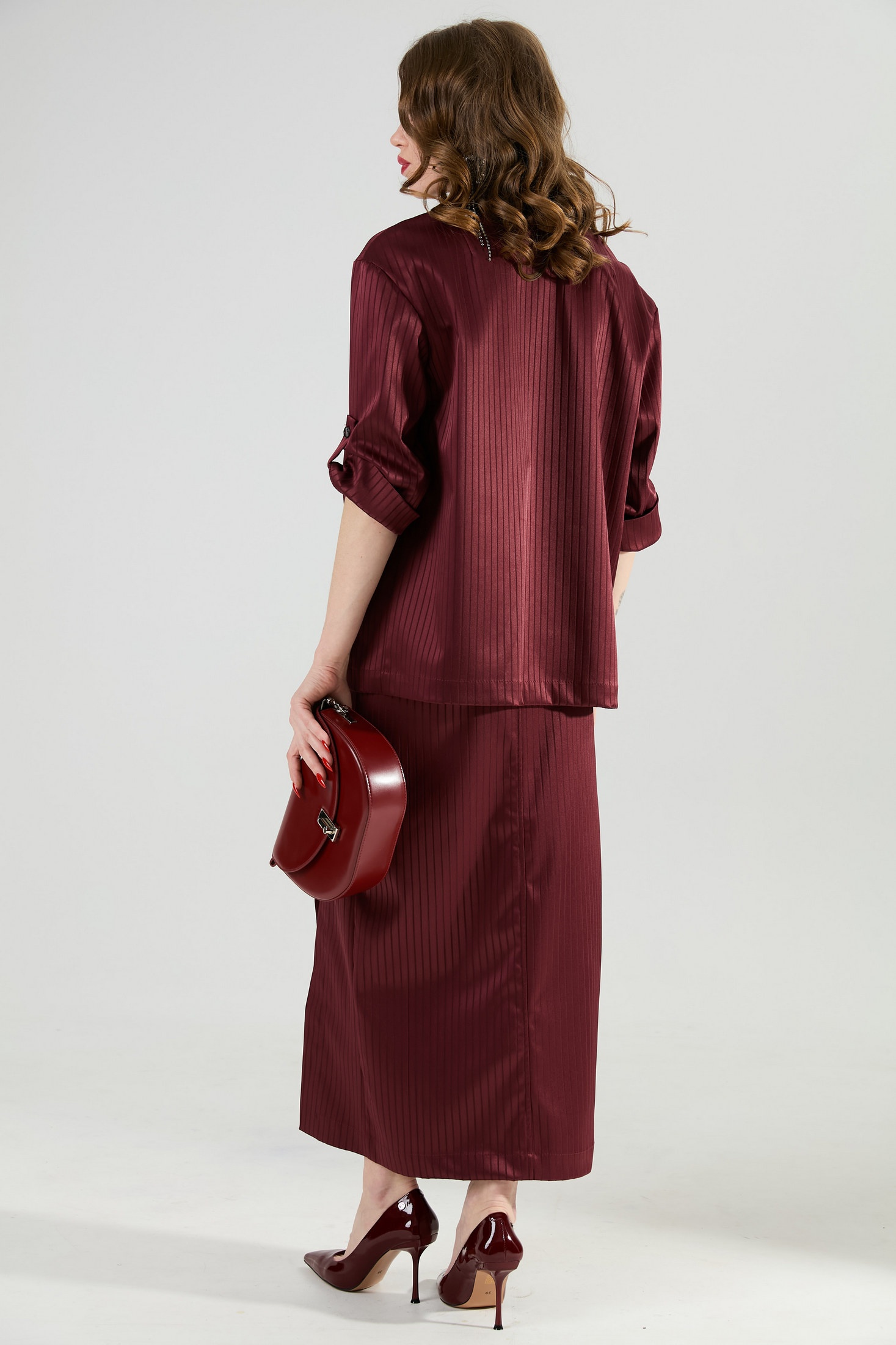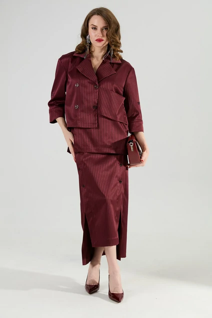 Костюм двухпредметный: состоит из жакета и юбки. Жакет прямого силуэта с имитацией центральной застёжки на пуговицы. Рукав втачной одношовный, длиной три четверти,застегивающийся на пату. Воротник пиджачного типа . Линия низа фигурная, симметричная . По левому переду расположена декоративная деталь. Юбка длиной миди, расклешенная к низу, с асимметричным низом. Пояс притачной, по спинке собран на резинку. Переднее полотнище состоит из трех частей. Правая часть скреплена отделочной строчкой и кнопками. В боковых швах изделия расположены карманы. По спинке изделия идёт средний шов и две вытачки для удачной посадки по фигуре. Юбка без подкладки.