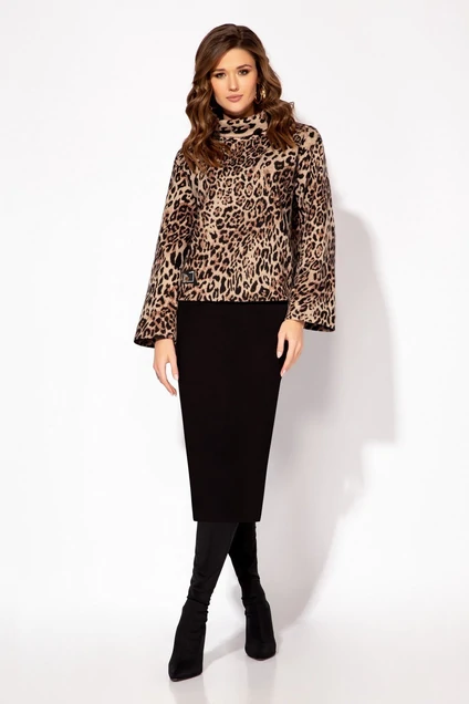Костюм женский (джемпер и юбка). Джемпер из трикотажного полотна, прямого силуэта, с втачными рукавами, с втачным воротником по горловине. На детали переда с левой стороны по низу пришита нашивка. Рукава втачные одношовные. Вырез горловины «под горло», с втачным воротником.