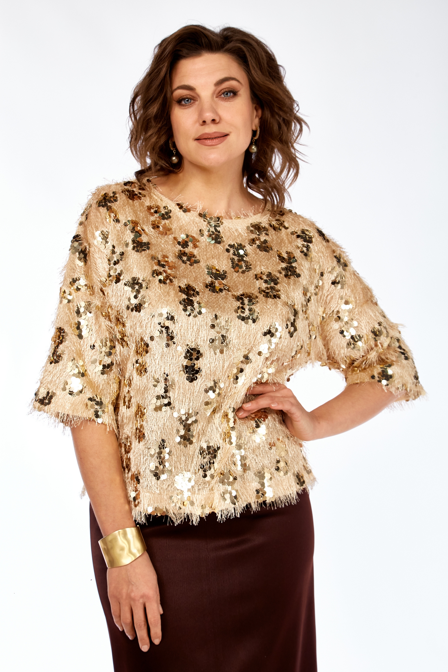 Шикарный комплект, сочетающий мягкую бахрому с пайетками и атлас -must-have сезона. Блузка нарядная прямого силуэта, из интересной ткани с бахромой и паетками. Вырез горловины округлой формы, со спущенным рукавом длиной 3/4. Юбка длиной миди на поясе (резинка по бокам) из атласной ткани. По спинке средний шов, в который вставлена потайная молния, разрез по центру по полочке. Длина блузки 53см, длина юбки 92см