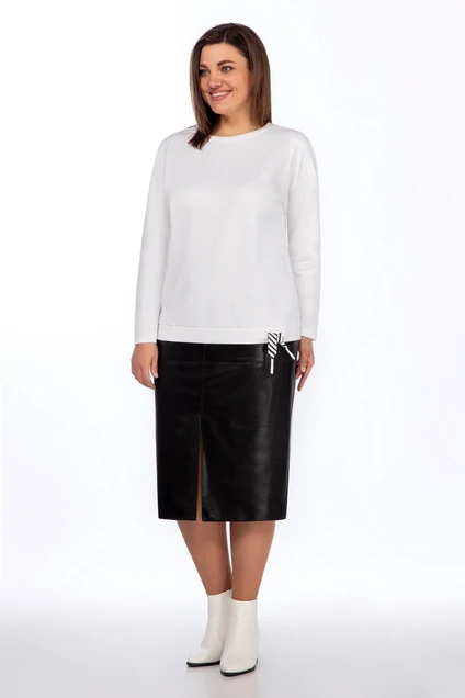 Юбка из ткани кожа, зауженная к низу, по передним полотнищам горизонтальные подрезы с отстрочкой и со средним швом заканчивающая разрезом. В среднем шве заднего полотнища обработана застежка на потайную тесьму-молнию, верхний срез обработан притачным поясом, в боковых швах карманы. длина джемпера 65см, длина рукава 61см , длина юбки 73 см