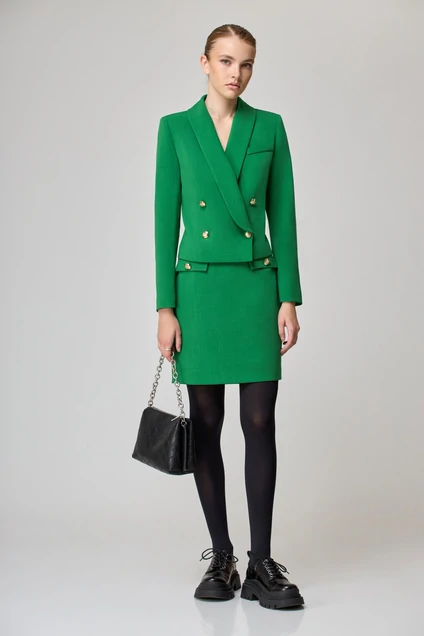 Костюм полуприлегающего силуэта, втачного покроя с двубортной застежкой на петли-пуговицы, на подкладке.