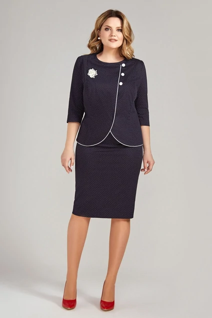 Элегантный, статусный костюм из хлопковой ткани , рисунок в мелкий горошек. Жакет полуприлегающего силуэта, с рельефными швами , с асимметричной застежкой на навесные петли пуговицы, в борт втачен белый кант. Спинка с рельефами и средним швом. Юбка- карандаш на притачном поясе , застежка на петли пуговицы. На заднем полотнище среднй шов и шлица. Шикарный вариант как на работу, так и для выхода в свет. 54 Жакет: Длина изделия - 57см, Длина рукава - 43см, Ширина плеча - 11см, Ширина по груди - 59см, Ширина по низу - 61см, Ширина рукава - 21см Юбка: Длина изделия - 62см, Ширина по бедрам - 57см, Ширина по талии - 48см 56 Жакет: Длина изделия - 57см, Длина рукава - 43см, Ширина плеча - 11см, Ширина по груди - 61см, Ширина по низу - 63см, Ширина рукава - 21,5см Юбка: Длина изделия - 63см, Ширина по бедрам - 59см, Ширина по талии - 50см 58 Жакет: Длина изделия - 57см, Длина рукава - 43см, Ширина плеча - 11см, Ширина по груди - 63см, Ширина по низу - 65см, Ширина рукава - 22см Юбка: Длина изделия - 63см, Ширина по бедрам - 61см, Ширина по талии - 52см 60 Жакет: Длина изделия - 57см, Длина рукава - 43см, Ширина плеча - 11см, Ширина по груди - 65см, Ширина по низу - 67см, Ширина рукава - 22,5см Юбка: Длина изделия - 63см, Ширина по бедрам - 63см, Ширина по талии - 54см 62 Жакет: Длина изделия - 57см, Длина рукава - 43см, Ширина плеча - 11см, Ширина по груди - 67см, Ширина по низу - 69см, Ширина рукава - 23см Юбка: Длина изделия - 64см, Ширина по бедрам - 65см, Ширина по талии - 56см