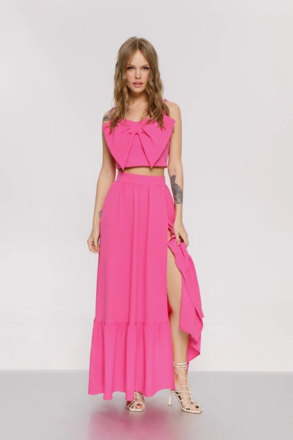 Костюм-двойка из укороченного топа с декоративным элементом-бантом и макси-юбки на запах с высоким разрезом. Детали: топ полуприлегающего силуэта, нагрудные вытачки, глубокий V-образный вырез переда и спинки, застежка на потайную молнию в шве. Юбка с высокой посадкой, широкий притачной пояс с резинкой по спинке, без застежки, боковые карманы