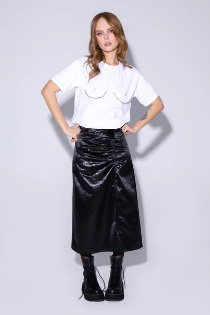 Комплект-двойка из трикотажной хлопковой футболки с декором-вышивкой из страз и асимметричной миди-юбки из атласной ткани с дизайном. Детали: футболка прямого силуэта, перед с вышивкой из страз, круглая горловина, рукава короткие. Юбка асимметричного кроя с высоким разрезом и драпировкой, пояс на обтачках, потайная застежка в среднем шве спинки.