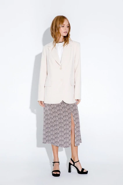 Комплект-двойка из фактурного жакета и атласной юбки с цветочным принтом