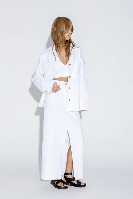 Джинсовый костюм- двойка из свободной рубашки и миди-юбки с высоким разрезом