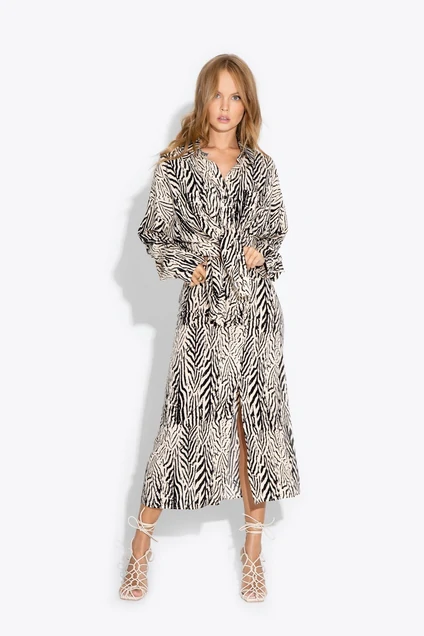 Текстильный костюм-двойка из свободной рубашки и асимметричной юбки из вискозы с анималистичным принтом