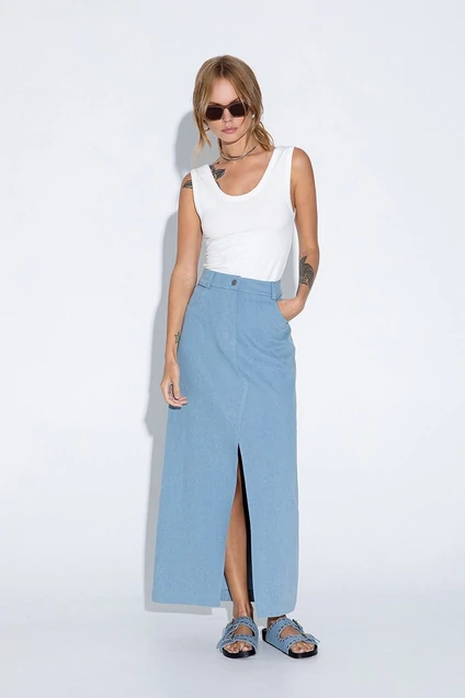 Комплект-двойка из трикотажной майки в рубчик и джинсовой макси-юбкой с высоким разрезом