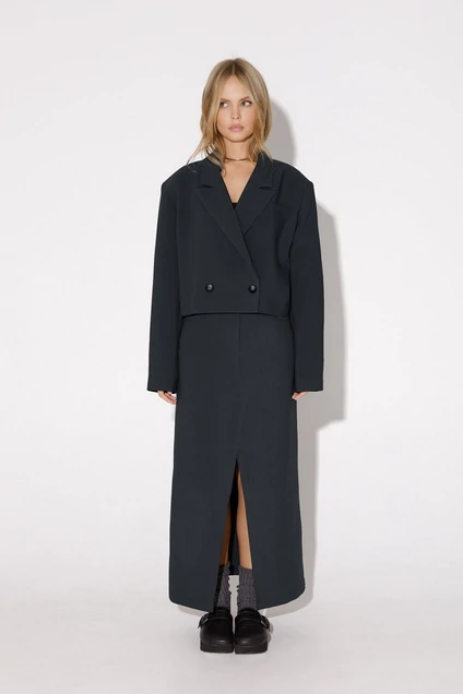 Костюм-двойка из укороченного оверсайз жакета с расширенными плечами и миди-юбки с разрезом. Детали: прямой силуэт, спущенная линия плеча, пиджачный воротник, перед с функциональным нагрудным карманом, застежка двубортная на петли и пуговицы, рукава втачные двухшовные, жакет на подкладке. Юбка асимметричного кроя с высоким разрезом по переду, притачной пояс со шлевками, застежка на молнию и пуговицу, боковые карманы.