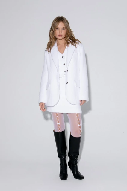 Костюм-двойка из оверсайз жакета и прямой мини-юбки из фактурной ткани. Детали: жакет прямого силуэта, расширенная линия плеч, пиджачный воротник, перед с прорезными функциональными карманами, однобортная застежка на петли и пуговицы, спинка со средним швом и шлицей, рукава втачные двухшовные, жакет на подкладке. Юбка на притачном поясе, застежка сзади на потайную молнию, юбка на подкладке.