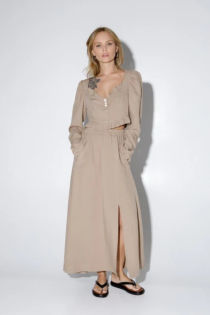 Льняной костюм-двойка из укороченной блузы с декором и макси-юбки с разрезом. Детали: блуза полуприлегающего силуэта, рельефы и талиевые вытачки, глубокий кареобразный вырез переда, длинные рукава с оборками, застежка на потайную молнию в боковом шве, перед блузы на подкладке. Юбка на притачном эластичном поясе, функциональные карманы, подкладка юбки 100% вискоза. Длина блузы с оборкой около 37,5 см в размерах 40-46 и около 42 см в размерах 48-52, длина рукава с оборкой около 64 см. Длина юбки по боковому шву с поясом около 94 см