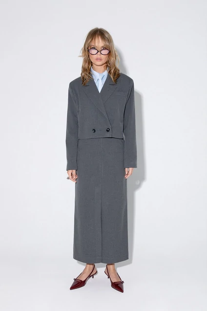 Костюм-двойка из укороченного оверсайз жакета с расширенной линией плеч и прямой макси-юбки с высоким разрезом.