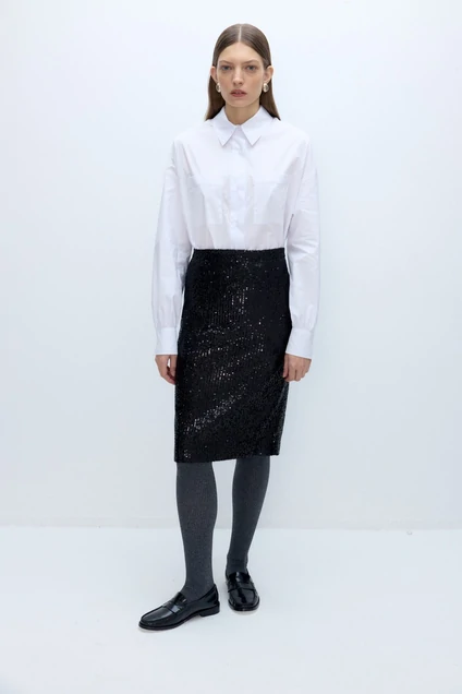 Комплект-дво йка из хлопковый оверсайз рубашки и юбки-карандаш в пайетки.