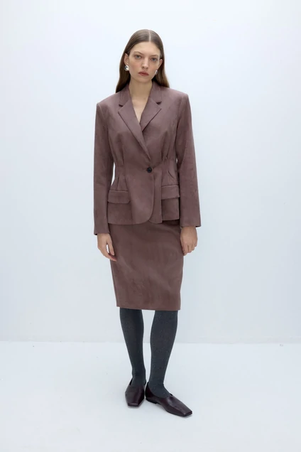 Замшевый костюм-двойка из укороченного приталенного жакета со складками и юбки-карандаш.
