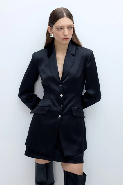 Атласный костюм-двойка из удлиненного приталенного жакета с декоративными пуговицами и мини-юбки.