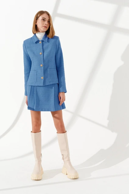 Укороченный жакет полуприлегающего силуэта из текстильной ткани. Детали: пиджачный воротник, накладные карманы, застежка на пуговицы, рукава втачные двухшовные, жакет на подкладке.