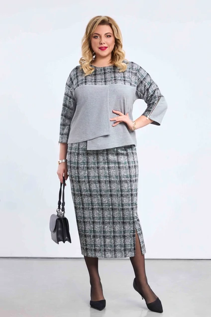 Женский костюм двойка, состоящий из джемпера и удлиненной юбки. Костюм выполнен из трикотажа на сочетании однотона и рисунка. Джемпер прямого силуэта с комбинированным покроем рукава, где кокетка переда переходит в часть рукава. Нижняя часть проймы отрезная. В шве кокетки по низу рукава есть металлическая тесьма молния. Вырез горловины округлый. Нижняя часть переда двойная, выполнена с нахлестом правой части переда на левую часть, что создает ступенчатую линию низа. Юбка зауженная к низу, удлиненная, на притачном поясе, в котором располагается эластичная тесьма. По переду юбки с правой стороны есть рельеф, по низу которого располагается высокий разрез.