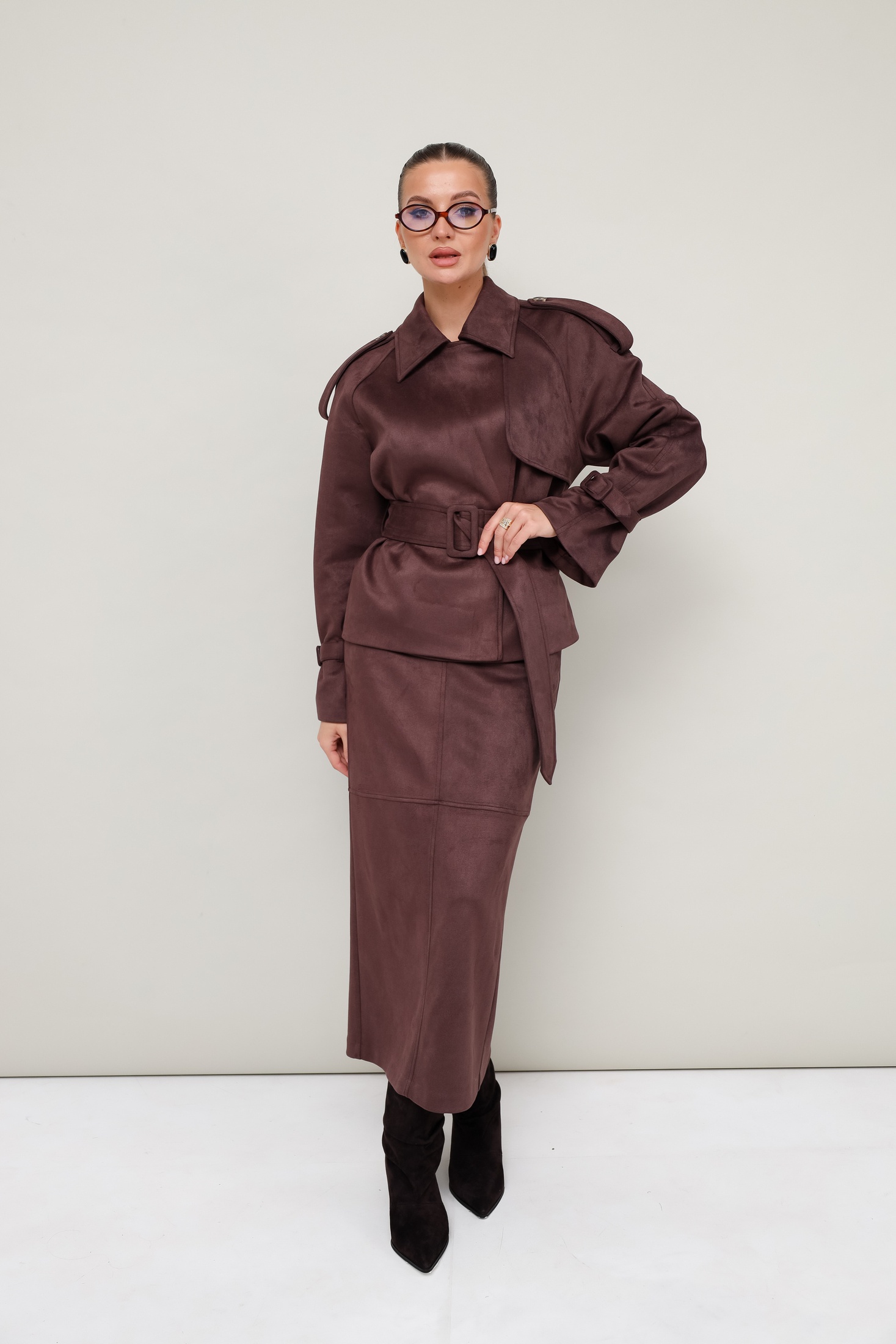 Стильный 2-предметный комплект, состоящий из жакета и юбки, выполненный из экозамши.