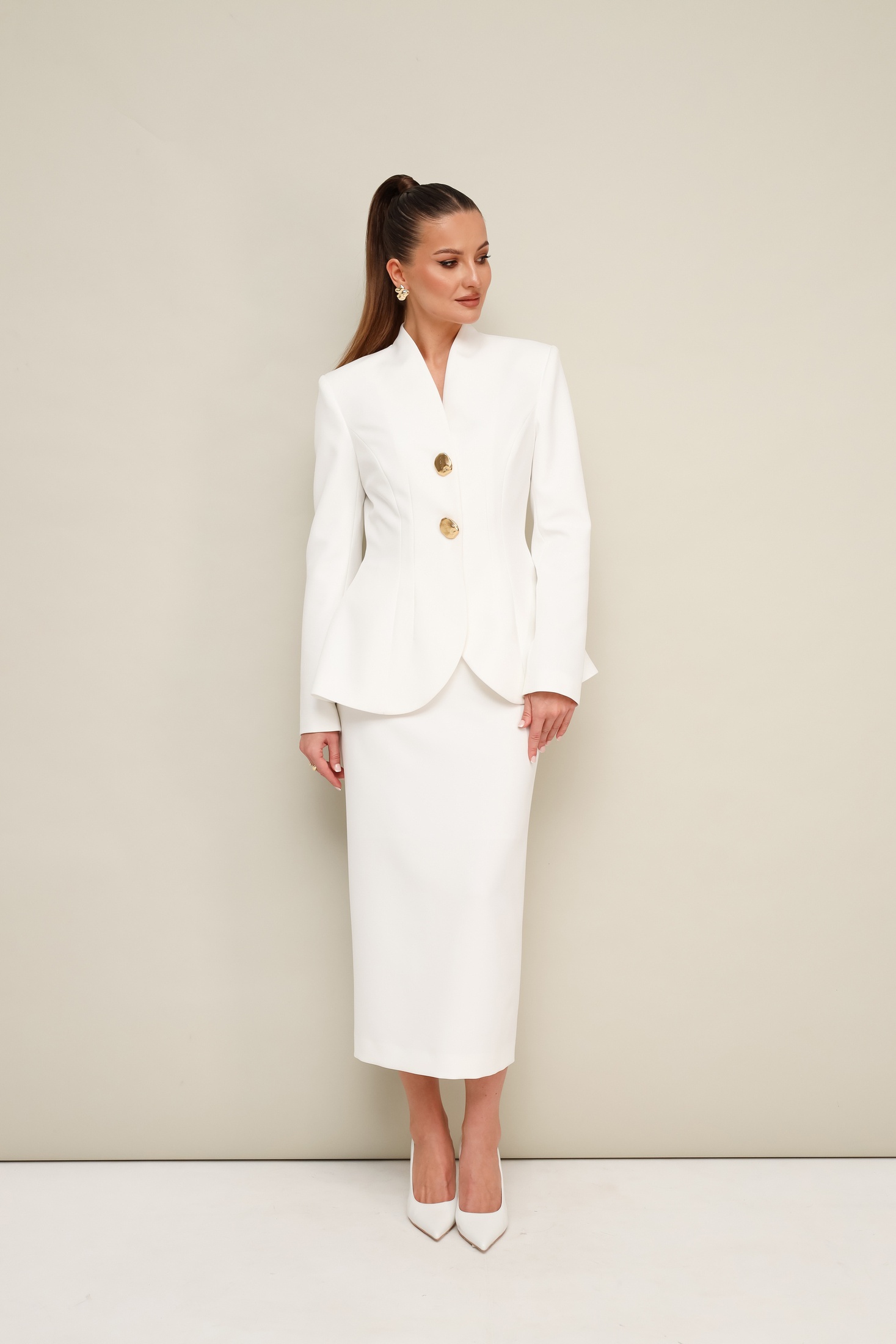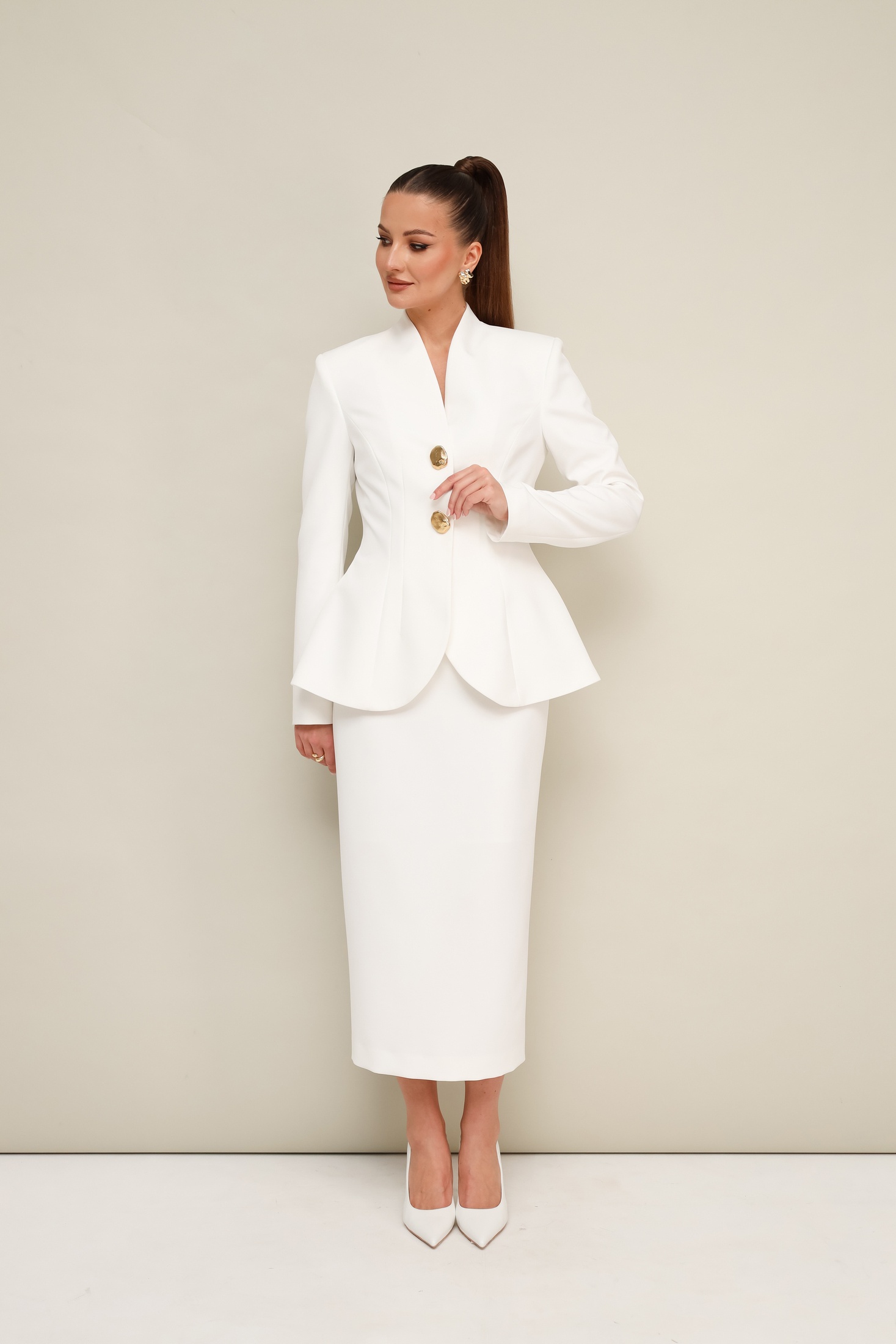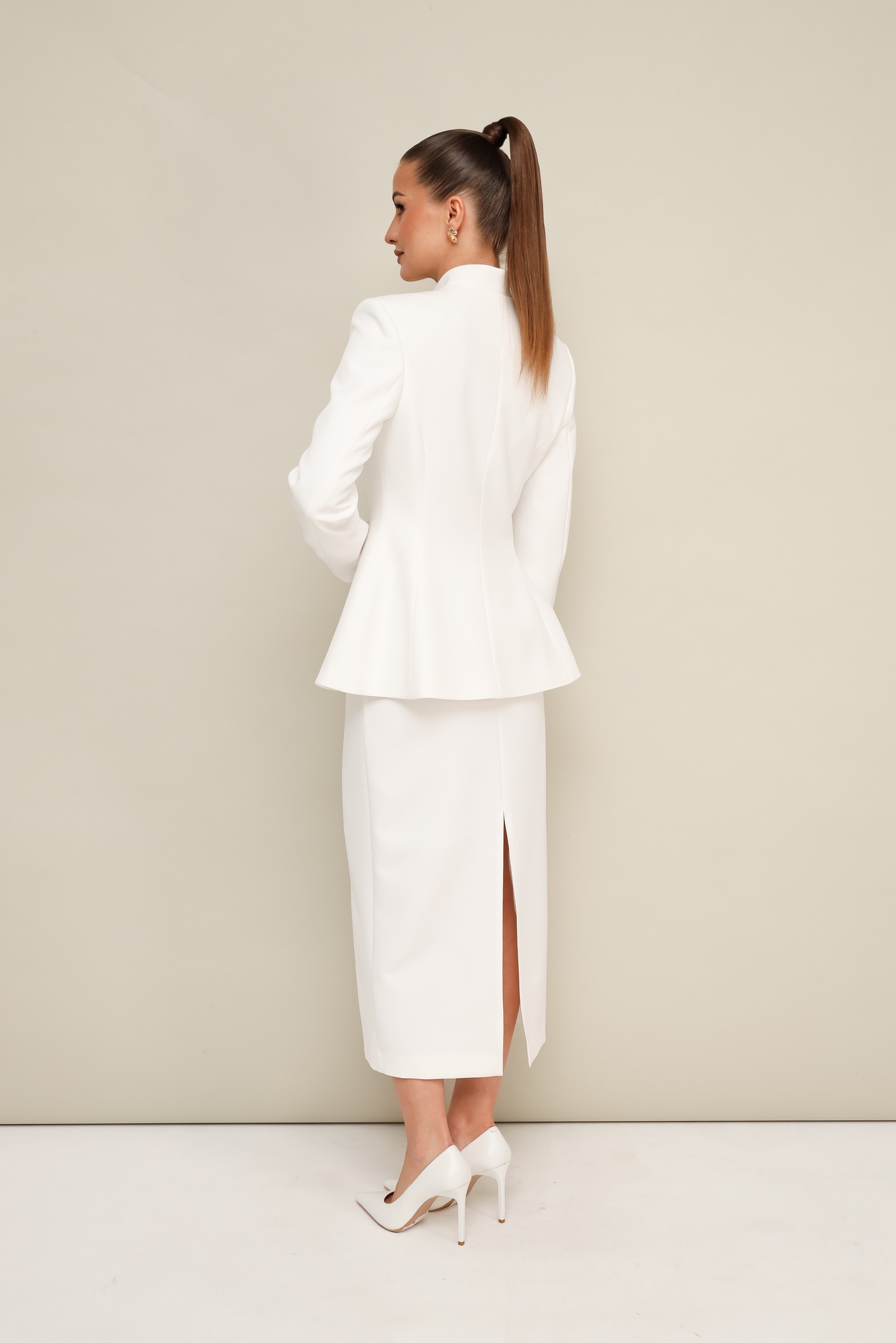 Костюм с юбкой 11-452 Pur Pur от коллекции бренда Pur Pur — это стильный и универсальный наряд для современных женщин. Комплект из жакета и юбки выполнен из костюмной ткани с добавлением полиэстера и спандекса, что обеспечивает комфорт и небольшую эластичность. Жакет прилегающего силуэта с цельнокроеной стойкой и V-образным вырезом акцентирован декоративными пуговицами. Юбка миди-длины с удобной шлицей и потайной молнией на спинке добавляет утонченности. Благодаря подкладке костюм идеален для офиса и деловых встреч. Белый цвет и строгий крой подойдут как для осеннего, так и для весеннего гардероба.