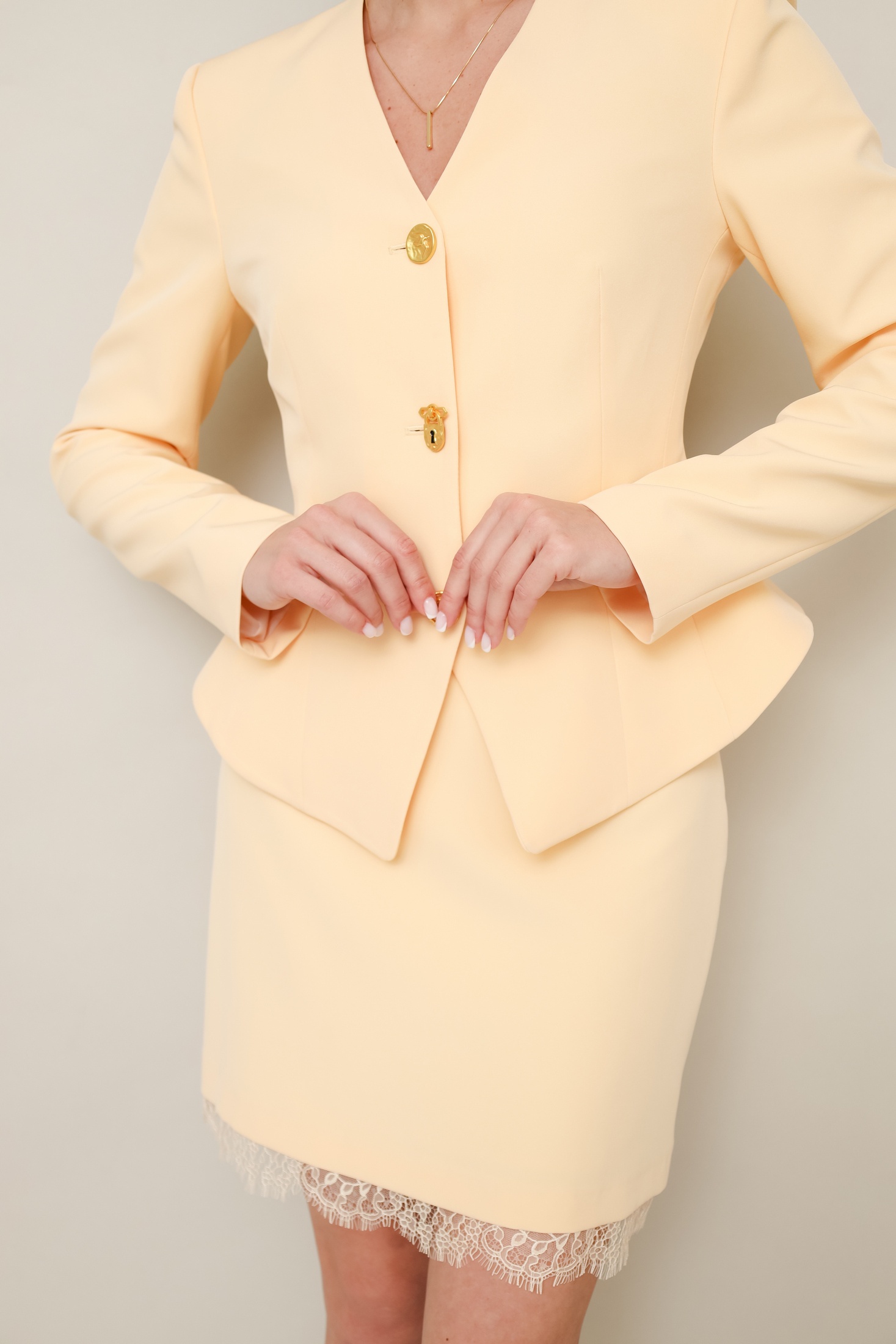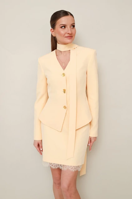 Комплект, состоящий из жакета, юбки и шарфа, выполнен из костюмной ткани.