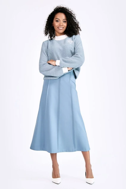 Комплект состоит из свитшота и юбки. Свитшот свободного силуэта. Горловина круглая. Рукав втачной. Горловина, манжеты рукава выполнены из ткани контрастного цвета. На передней полочке авторская вышивка. Юбка "восьмиклинка" длины "миди" на поясе. В боковом шве потайная молния, а также застежка на петлю-пуговицу. Низ 80% п/э 17% вискоза 3% спандекс