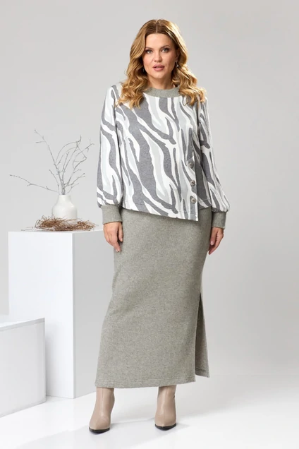 Костюм женский, предназначен для повседневной носки. Костюм женский 2-х предметный джемпер и юбка. Джемпер женский, прямого силуэта, длиной до линии бёдер с фигурным низом. Перед с одной нагрудной вытачкой с отрезным бочком слева, шов соединения бочка с передом заканчивается шлицей, декорированной 3-мя пришивными пуговицами. Спинка цельнокроеная. Горловина круглая с втачной планкой-стойкой из отделочной ткани. Рукав втачной, длинный, одно шовный, низ с лёгкой сборкой и притачной манжетой из отделочной ткани. Джемпер с плечевыми накладками. Юбка женская, слегка заужена к низу, длиной до нижней части икры. Переднее и заднее полотнище цельнокроеные. Боковые швы с разрезами. Юбка с притачным поясом, собранным на эластичную тесьму. Юбка на подкладке. Длина юбки по боковому срезу 87 см. Длина спинки джемпера 60 см. Длина рукава 59 см.