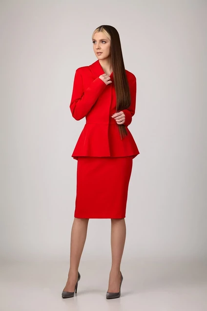 Комплект женский из стрейчевой костюмной ткани на подкладке. Жакет приталенного силуэта с рельефами по переду и спинке, отрезной по линии талии, с роскошной баской. Утонченности добавляет небольшой воротник округлой формы. Рукава - втачные, двухшовные. Застежка на пришивные кнопки. Юбка на подкладке, слегка зауженная к низу, без пояса. Верх юбки обработан обтачкой. Шлица в среднем шве заднего полотнища юбки обеспечит свободу движения. Застежка - молния в среднем шве юбки. Цвет красный.