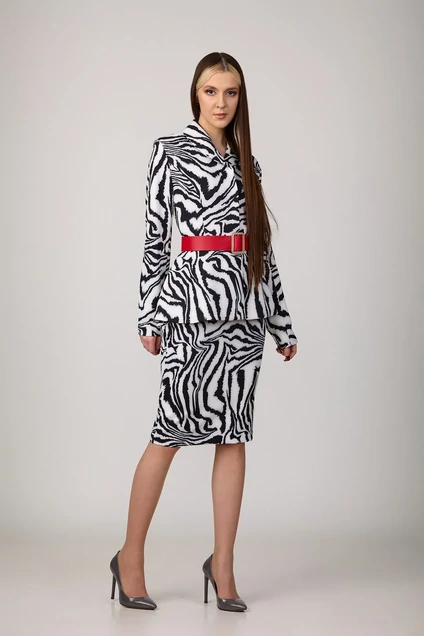 Комплект женский из стрейчевой костюмной ткани на подкладке. Жакет приталенного силуэта с рельефами по переду и спинке, отрезной по линии талии, с роскошной баской. Утонченности добавляет небольшой воротник округлой формы. Рукава - втачные, двухшовные. Застежка на пришивные кнопки. Юбка на подкладке, слегка зауженная к низу, без пояса. Верх юбки обработан обтачкой. Шлица в среднем шве заднего полотнища юбки обеспечит свободу движения. Застежка - молния в среднем шве юбки. Пояс в комплект не входит. Цвет черно-белый.