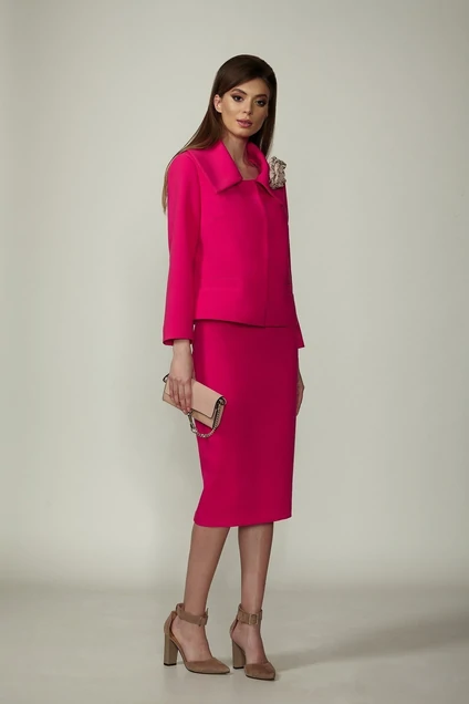 Комплект из костюмной ткани на подкладке, состоящий из жакета и юбки. Жакет прямого силуэта с нагрудными вытачками и прорезными карманами с листочками по переду. Воротник - широкий с отрезной стойкой, рукава – двухшовные, длиной 7/8. Застегивается на пришивные кнопки. На воротнике жакета - цветок ручной работы. Юбка на подкладке, слегка зауженная к низу, без пояса. Верх юбки обработан обтачкой. Шлица в среднем шве заднего полотнища юбки обеспечит свободу движения. Застежка - молния в среднем шве юбки. Цвет - малина.