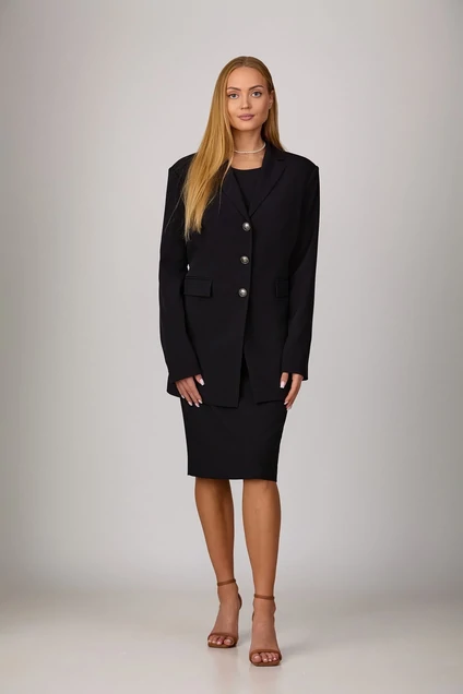 Комплект-тройка , состоящий из пиджака, блузы-топа и юбки. Пиджак из костюмной ткани на подкладке с расширенной линией плеч, с отрезными бочками по переду и спинке и вытачками по переду. Воротник-с отложными лацканами пиджачного типа. По переду - прорезные карманы с клапанами. Рукава длинные, двухшовные. Пиджак застегивается на три пуговицы. Блуза-топ из костюмной ткани на подкладке. Крой топа по косой, без молнии, с вытачками по переду. Юбка на подкладке, слегка зауженная к низу, без пояса. Верх юбки обработан обтачкой. Шлица в среднем шве заднего полотнища юбки обеспечит свободу движения. Застежка - молния в среднем шве юбки. Цвет черный.