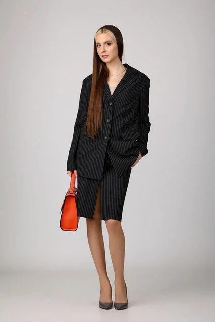 Комплект, состоящий из жакета и юбки из костюмной ткани на подкладке. Жакет с расширенной линией плеч, с отрезными бочками по переду и спинке и вытачками по переду. Воротник-с отложными лацканами пиджачного типа. По переду - прорезные карманы с клапанами. Рукава длинные, двухшовные. Жакет застегивается на три пуговицы. Юбка прямая с наклонными карманами и разрезом по переду , с широким поясом-обтачкой. Застегиваются на молнию сзади. Цвет черный в белую полоску.