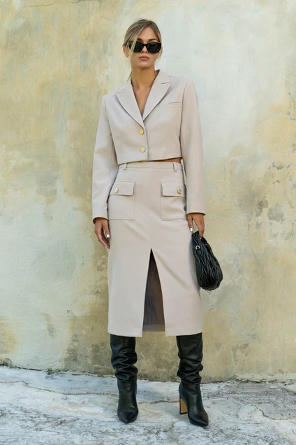 Стильный костюм с юбкой. Трендовый, укороченный кроп-жакет на подкладке. Полочка с нагрудной вытачкой, спинка со средним швом и отрезными бочками. Воротник пиджачного типа с отложным лацканом, на левой полочке листочка. Рукав втачной, двухшовный. Юбка прямого силуэта , на подкладке. По центру переда разрез и накладные карманы с клапаном и металлическими пуговицами. Застежка - потайная молния в среднем шве заднего полотнища. Модный женский костюм - выбор тех, кто стремится выглядеть презентабельно в любой ситуации. Длина жакета по среднему шву спинки 39,5 см. Длина рукава 61 см. Длина юбки по боковому шву с поясом 75 см. Высота разреза от низа юбки 37 см.