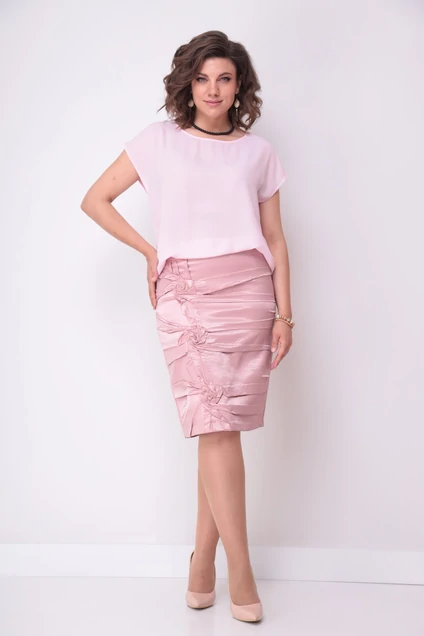 Нарядный комплект состоящий из юбки и блузы. Блуза со спущеной линией плеча, который прикрывает окат руки. Вырез округлый. Юбка с цельнокроеным поясом, застежка молния, шлица по задней части юбки. По передней части юбки ручная работа в виде розы. Юбка на подкладке. Передняя часть юбки дублируется, засчет чего хорошо держит форму. Ткань стабильная.