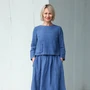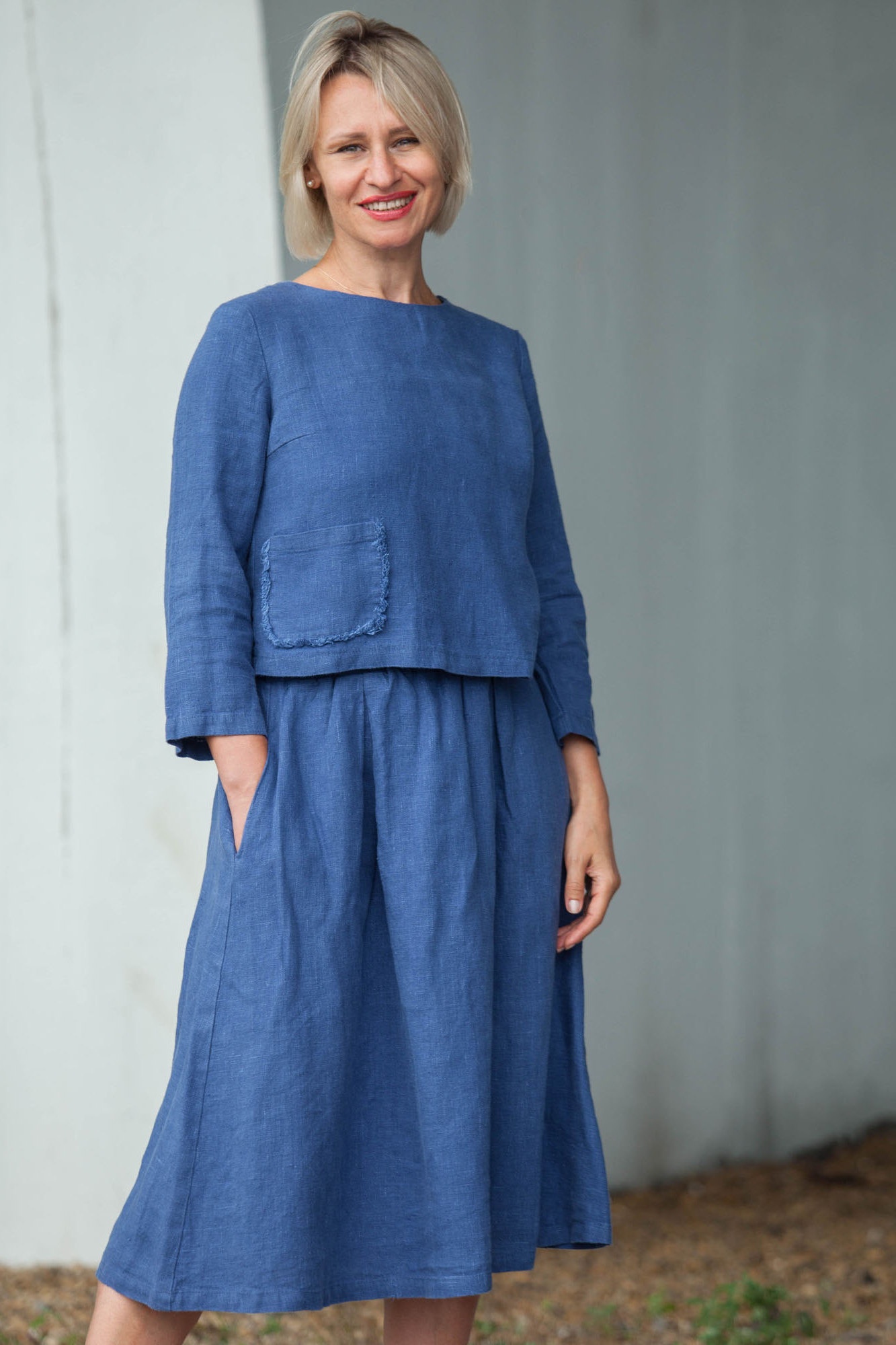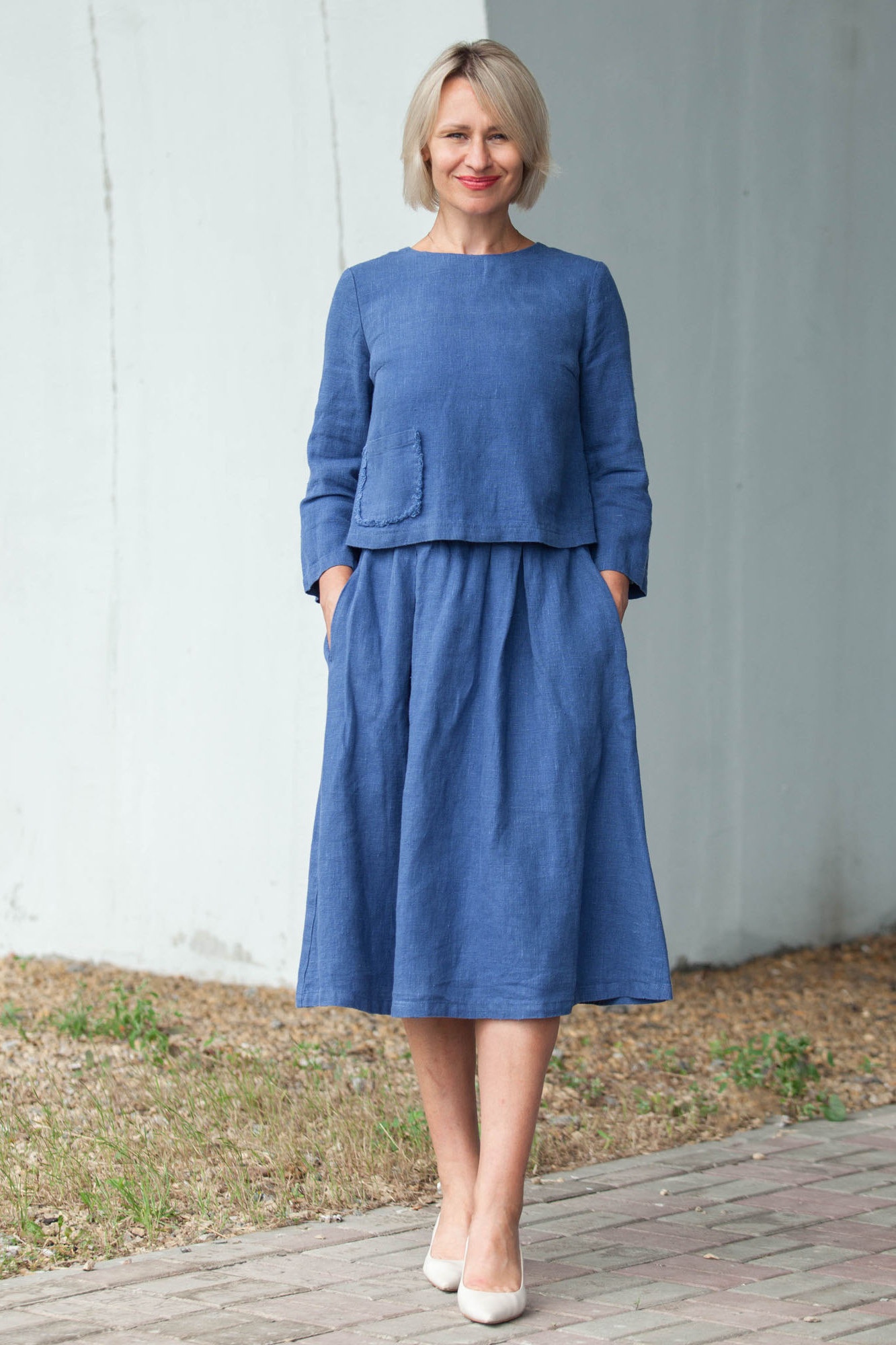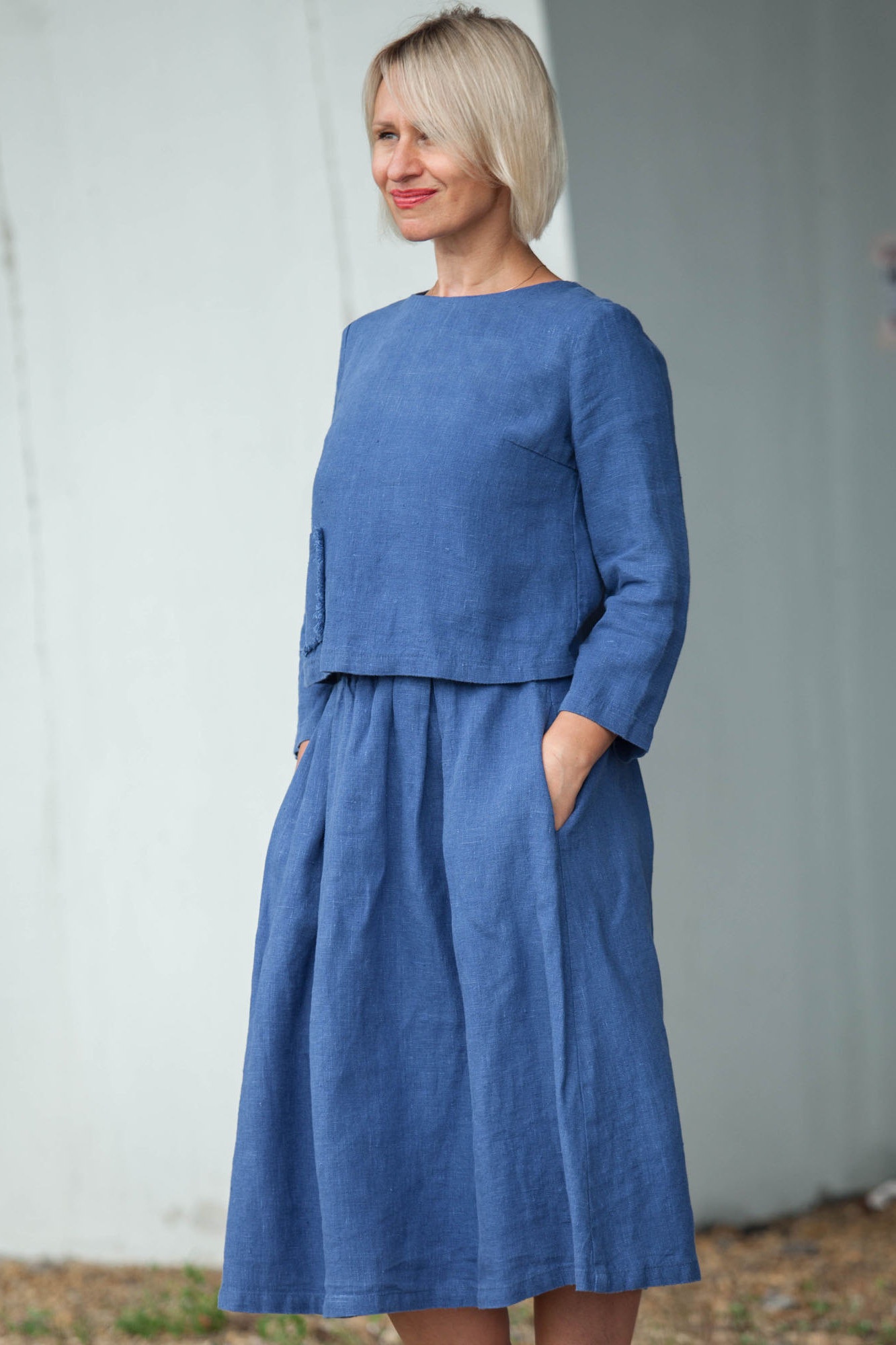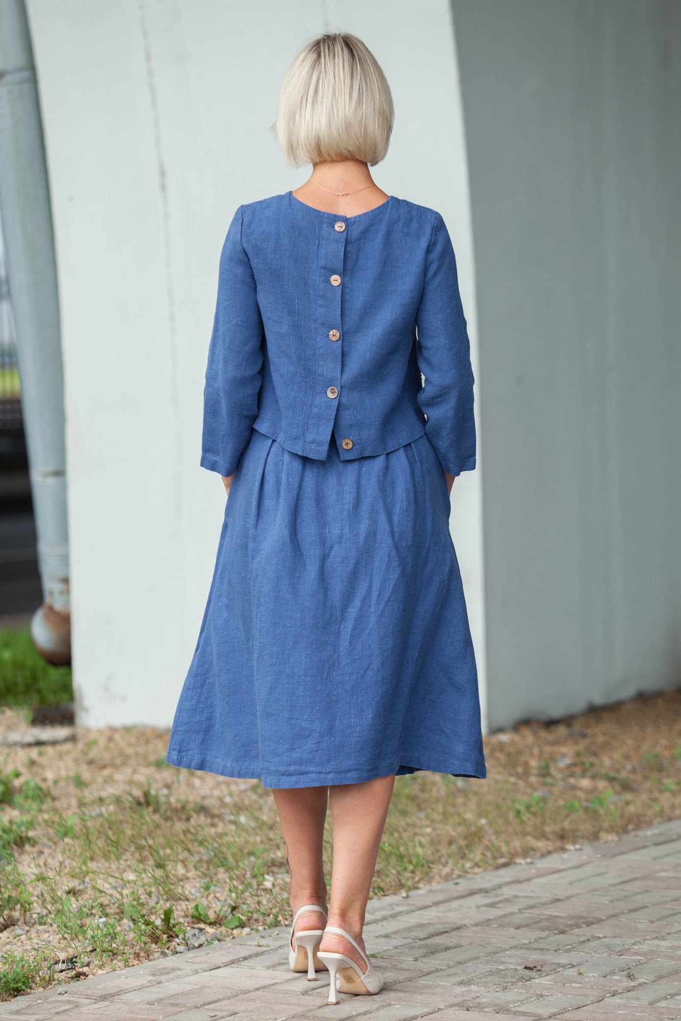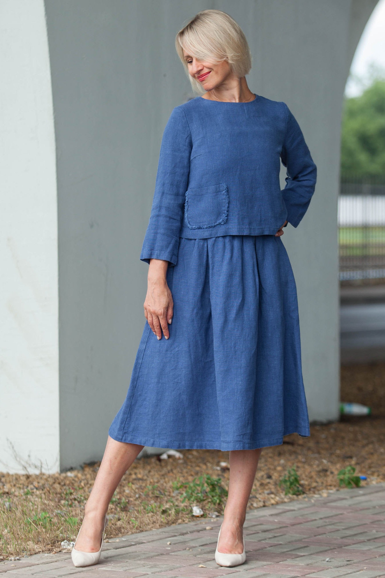 Костюм женский 2-х предметный, выполнен из плотной умягченной льняной ткани, состоит из жакета и юбки. Жакет укороченный с пуговицами на спинке. Юбка миди свободная, пояс на резинке. Костюм сочетает в себе классику и современный дизайн. Жакет можно использовать и в сочетании с другими элементами гардероба, отлично смотрится с джинсами, брюками, юбка сочетается с классическими блузами, рубашками.
