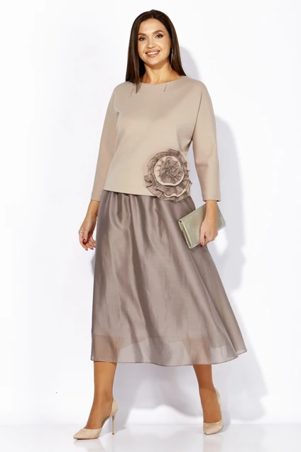 Комплект женский, 2х предметный, состоящий из блузки и юбки. Блузка полуприлегающего силуэта с цельнокройным рукавом длинной 3/4. Выполнена из трикотажного полотна "ТЕНСЕЛ". Вырез горловины "лодочка" По низу блузки, слева, декоративный элемент из рюши, в сочетании двух видов ткани. По спинке средний шов. Юбка широкая к низу, из текстильной ткани "вуалька" На подкладке. Пояс притачной с резинкой по кругу.