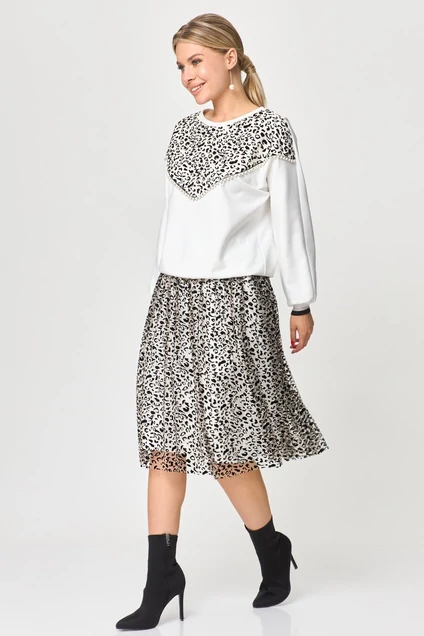 Нарядный комплект : трикотажный джемпер белого цвета с отделкой из «леопарда» и летящая юбка.