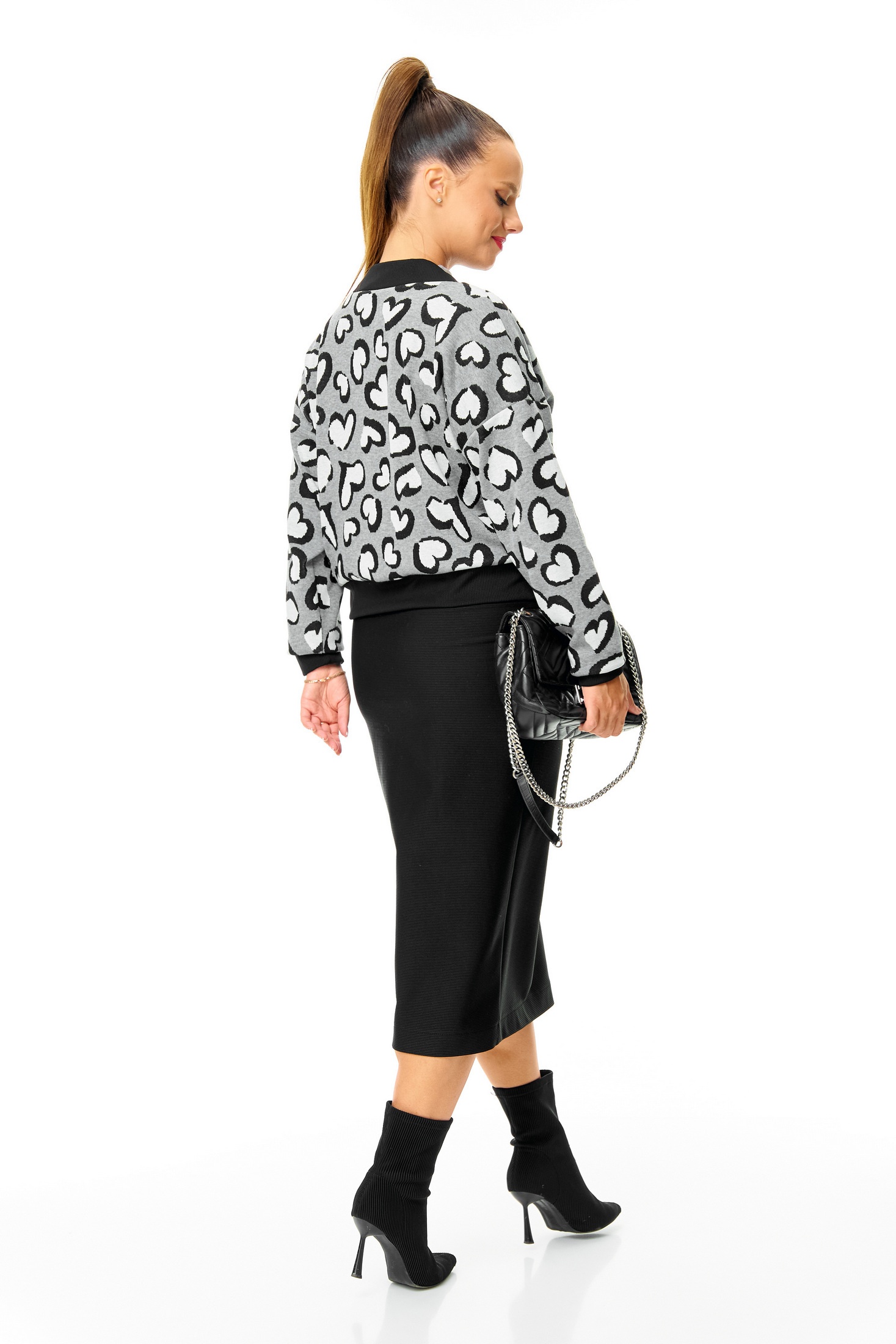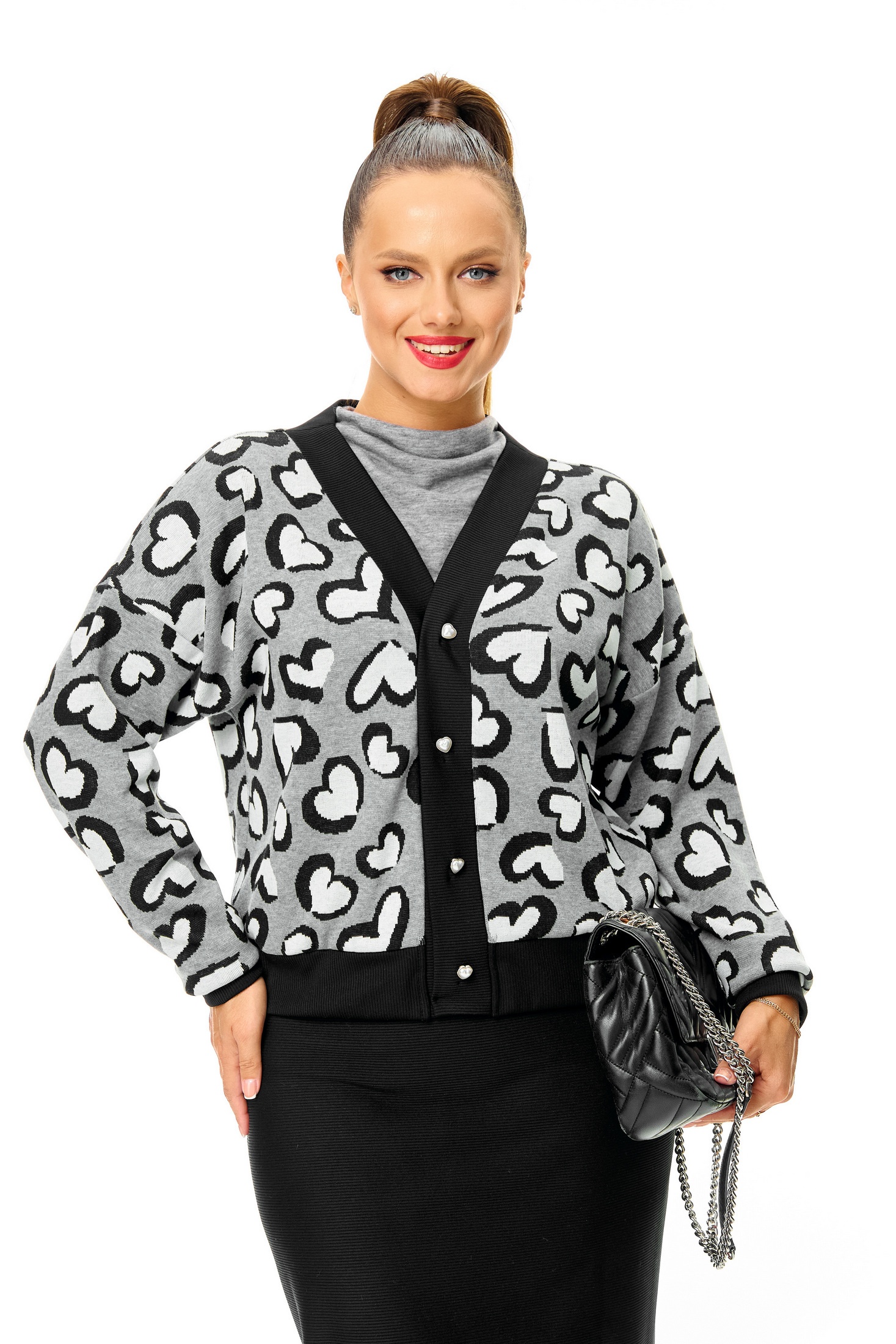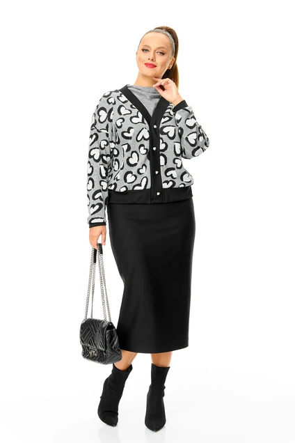 Стильный трикотажный комплект: укороченный кардиган и юбка-midi в современном сочетании дизайн «сердце» и черного.