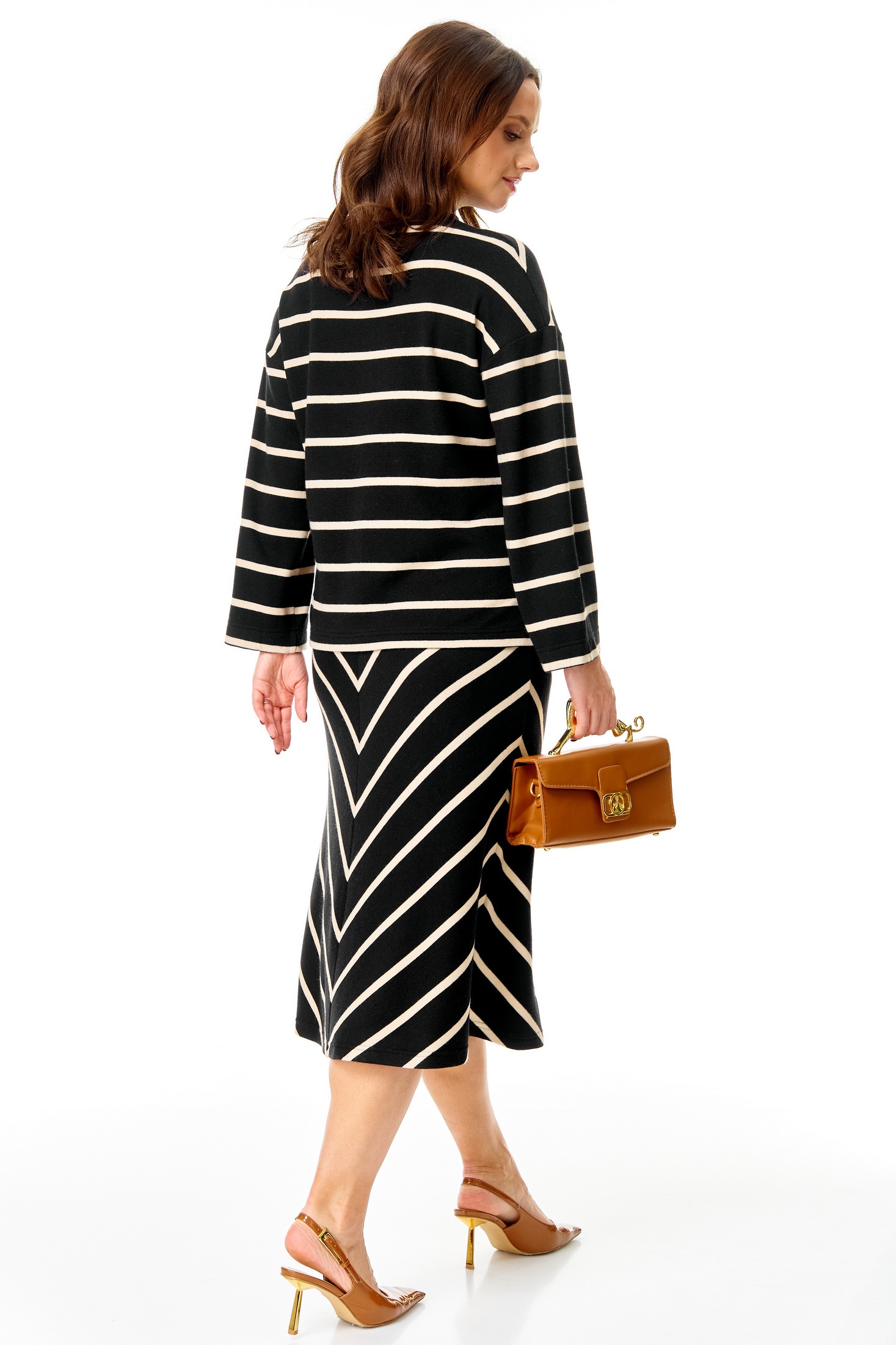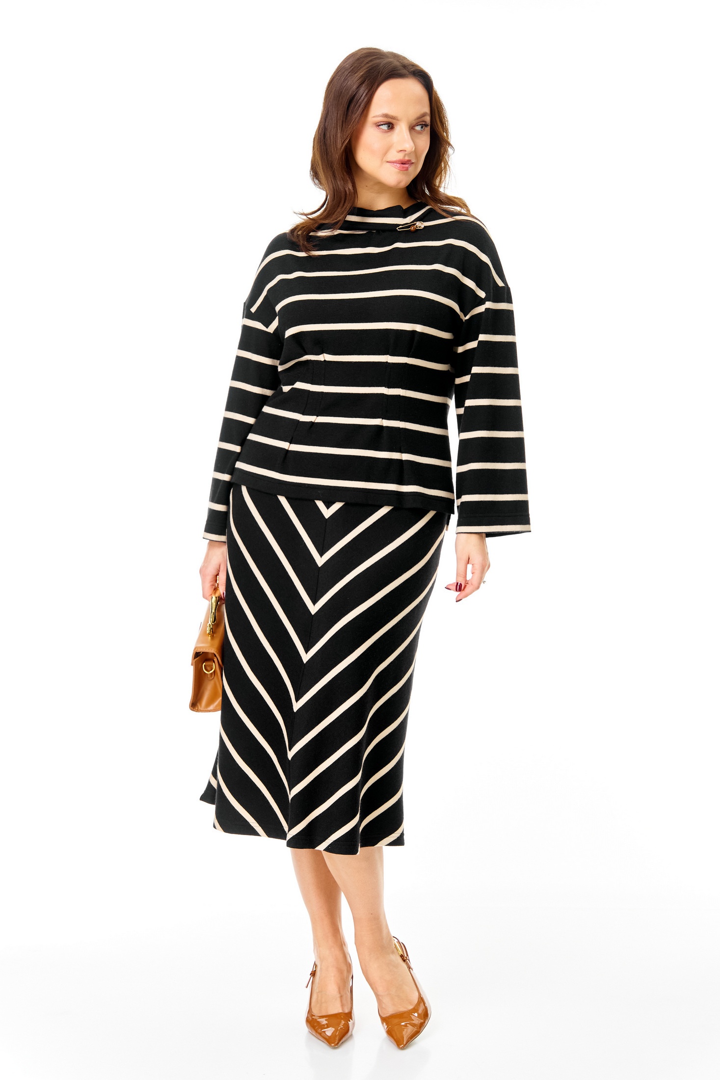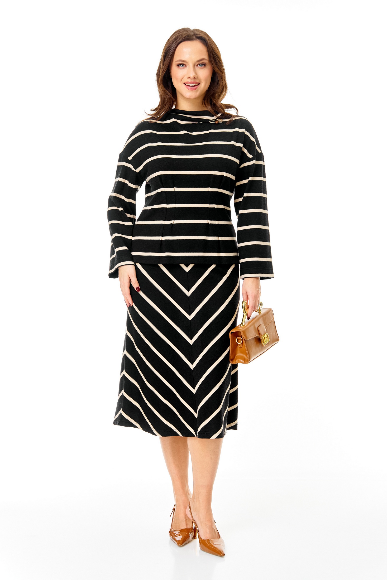 Костюм с юбкой 7732 Tender and nice — это стильный комплект из тонкого трикотажного полотна от коллекции бренда Tender and nice. Слегка приталенный джемпер и юбка-midi выполнены из мягкой и растяжимой ткани, содержащей вискозу, полиэстер и лайкру. Джемпер с горизонтальным рисунком в полоску имеет цельную горловину стойку и декоративную брошь, создающую эффектную складку. Длинный рукав добавляет комфорта в прохладное время года, а длина джемпера составляет 57-60 см. Юбка, расширенная к низу, на подкладке и с поясом на резинке, длиной 76 см, придает комплекту женственность. Идеально подходит для повседневного использования в демисезонный период.
